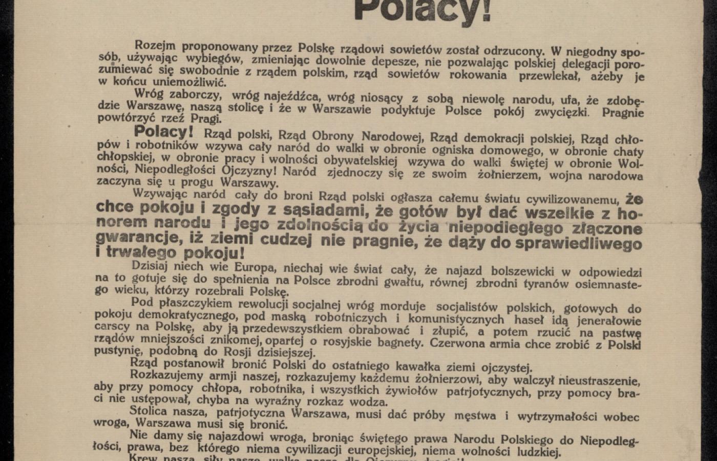 Bolszewicy stoją na Narwi, dwa kroki od Warszawy. [...] Czas najostatniejszy, aby obwarować Wisłę okopami i drutem – i nie oddać jej, póki żyje chociażby jeden mężczyzna [...]. Nie wierzę w rokowania i jestem ich przeciwnikiem, wierzę w oręż [...]. Rokowania przyniosą nam szereg upokorzeń, przemocy, hańby. A nam wolno zginąć, spodlić się nie wolno.