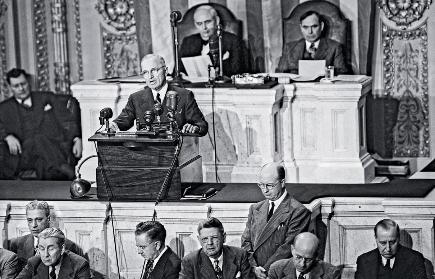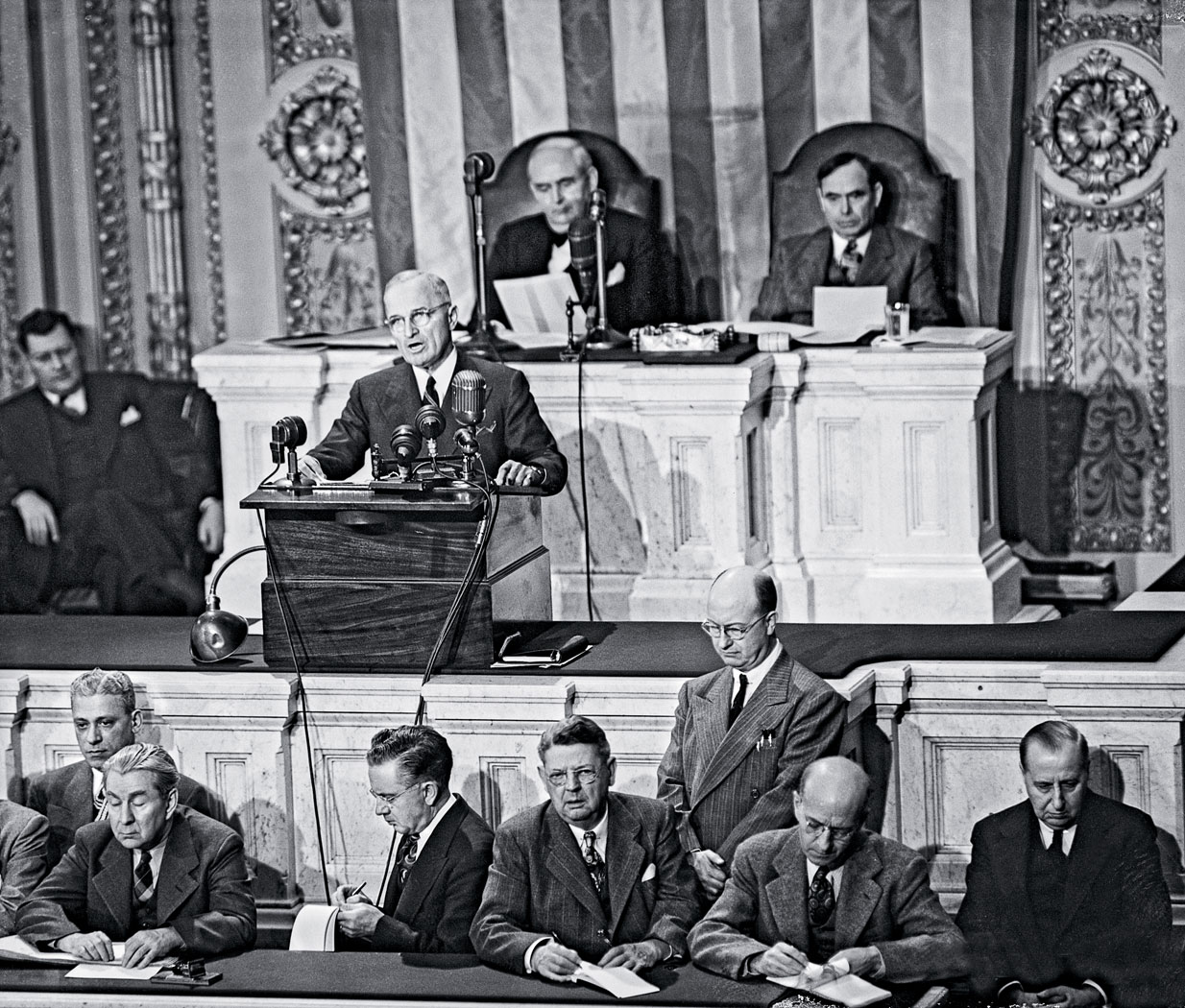 Punktualnie o godz. 13.00 12 marca 1947 r. prezydent Harry Truman rozpoczął przemówienie na Kapitolu. „Powaga sytuacji, w jakiej znalazł się dzisiaj świat – powiedział – powoduje konieczność mojego wystąpienia na połączonej sesji obu Izb Kongresu”. Następnie poinformował, że rząd brytyjski ogłosił zakończenie swojego programu pomocy dla Grecji i Turcji. Rząd grecki jest w niebezpieczeństwie – mówił – może skapitulować przed komunistyczną partyzantką w północnej części kraju. Jeżeli nie okażemy pomocy – kontynuował prezydent – ostatni demokratyczny kraj na Bałkanach dostanie się pod totalitarne rządy. „Jestem przekonany, że Stany Zjednoczone winny pomóc narodom, które przeciwstawiają się próbom podporządkowania przez uzbrojoną mniejszość albo nacisk z zewnątrz... Musimy działać natychmiast i w sposób zdecydowany... Dlatego proszę Kongres, aby zabezpieczył poparcie dla Turcji i Grecji w wysokości 400 milionów dolarów do 30 czerwca 1948 r.” (ówczesne 400 mln to dzisiejsze ok. 4 mld).