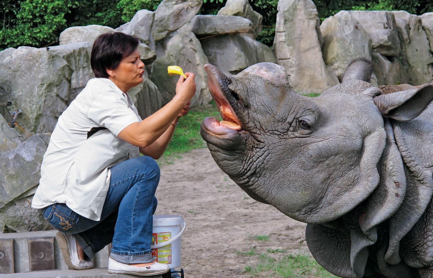 Pani Irenka robi nosorożcom poranną toaletę. Ale nie taką, że leje szlauchem, gdzie popadnie. Myje tam, gdzie nosorożec chce, odkręcając się w stronę strumienia. Woda miejska okropnie wysusza, więc pani Irenka po kąpieli spryskuje nosorożce oliwką. Potem w miękką skórkę pod fałdkami wciera olejek waniliowy, który odstrasza meszki. Po toalecie leci na wybieg dopilnować, czy podłoże jest odpowiednio miękkie, wybiera to kamyczki, to szkiełka, gdyż nosorożce mają niesamowicie wrażliwe nogi. Jak słonie. Na wolności pokonują duże przestrzenie, ścierając sobie naskórek, w zoo należy im się pedicure.