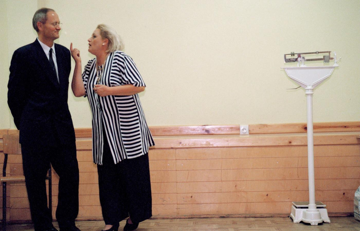Na sali siedzą przeważnie otyłości brzuszne, pośladkowe oraz typu odwrócona gruszka, u których tłuszcz przeniósł się, przy w miarę szczupłych nogach, w kierunku biustu. Klub kwadransowych grubasów w Brodnicy uroczyście inauguruje swą działalność. Wstają i składają przysięgę, że nie będę podjadał między posiłkami, natomiast spotykał się i podtrzymywał na duchu w dziele odchudzania.