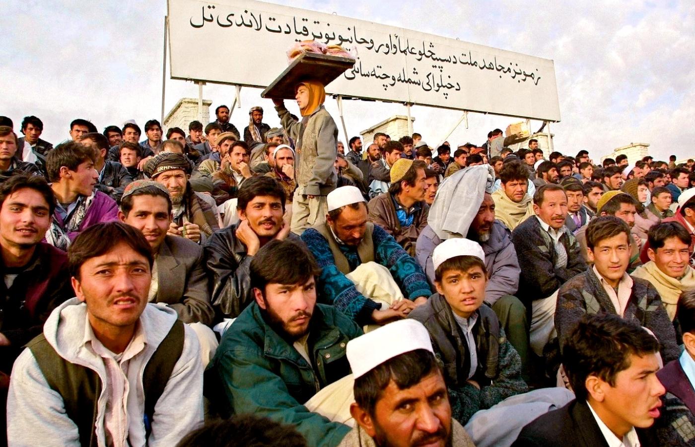 Na trybunach atmosfera pikniku. Pod ścianą podziurawioną kulami rozłożył się starzec w turbanie. Przygotowuje osłodzoną herbatę z mlekiem, którą w blaszanych dzbanuszkach zaniosą kibicom bosonodzy chłopcy. Na widowni – sami mężczyźni. Mówią, że