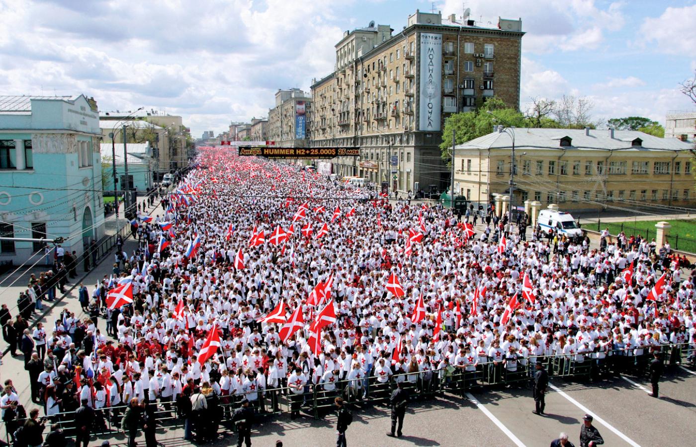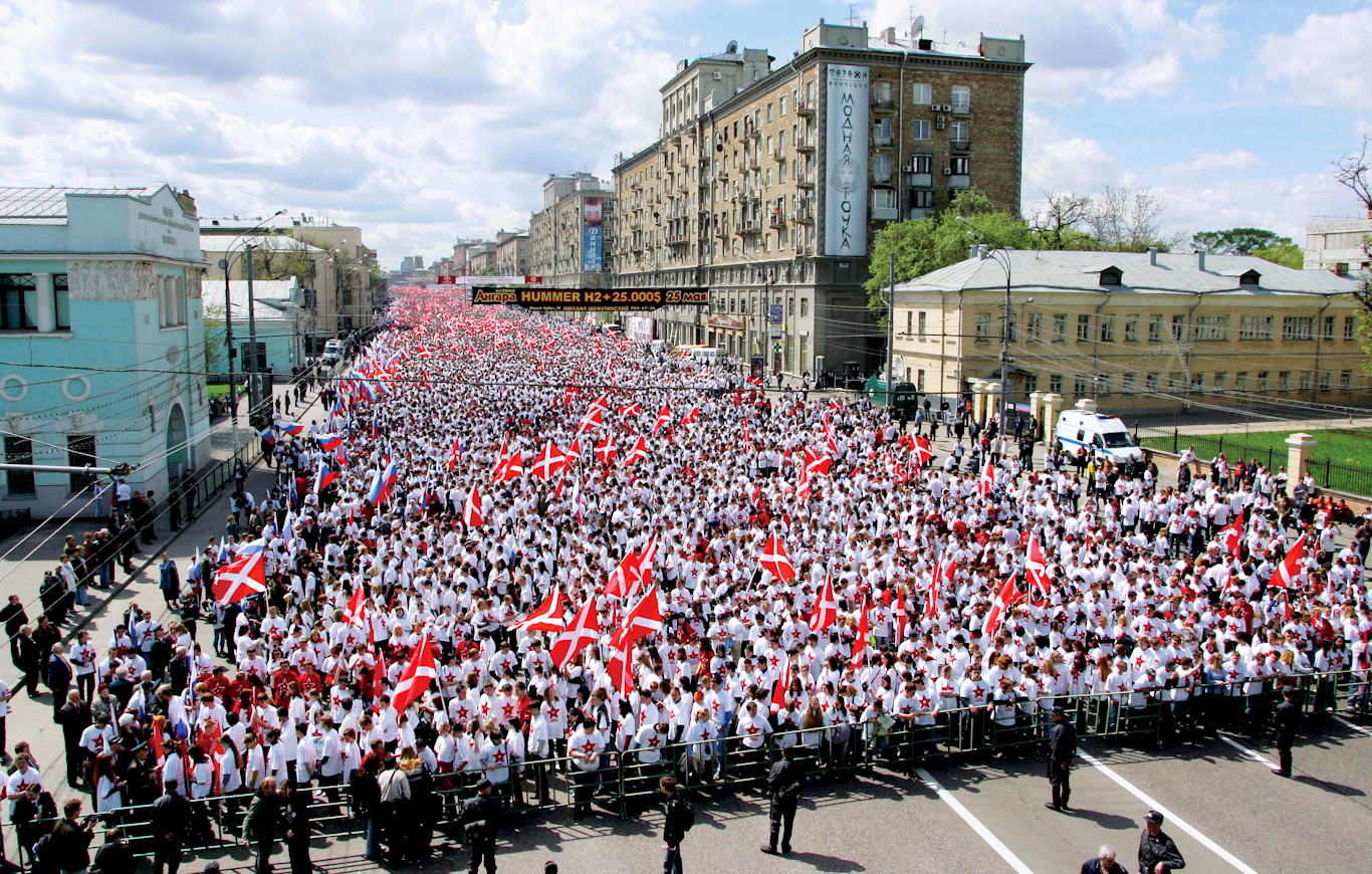 Nazwali się Nasi. Mają sztandar z białym krzyżem św. Jerzego na czerwonym tle i białe organizacyjne koszulki z czerwoną gwiazdą na piersi. Kiedy chcieli się pokazać i w sześćdziesiąt tysięcy wyszli na ulice Moskwy, miasto się szczerze zdziwiło: skąd się ich tyle wzięło? A Moskwę trudno zadziwić. Przechodnie przystawali popatrzeć na biało-czerwoną rzekę, komentowali: Zorganizowani są, równo idą! Dyscyplinę mają! I pieniądze – patrzcie, każdy, jeden w drugiego, z gwiazdką. Fabryka tekstylna z miesiąc musiała na nich pracować. Jasności tylko gapie nie mieli: Czyi oni są? O co im idzie? Ktoś czytał, i to w piątkowych „Izwiestiach” – więc na poważnie – że chcą rewolucję w Rosji zrobić, inny przysięgał, że w telewizji widział, jak ich wódz obejmował się z Putinem, więc o rewolucji mowy być nie może.