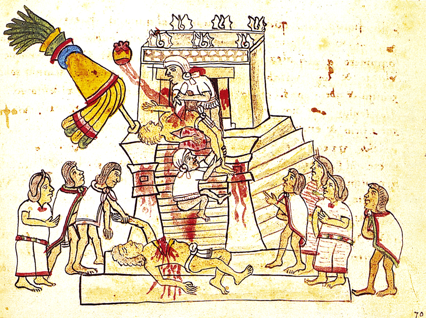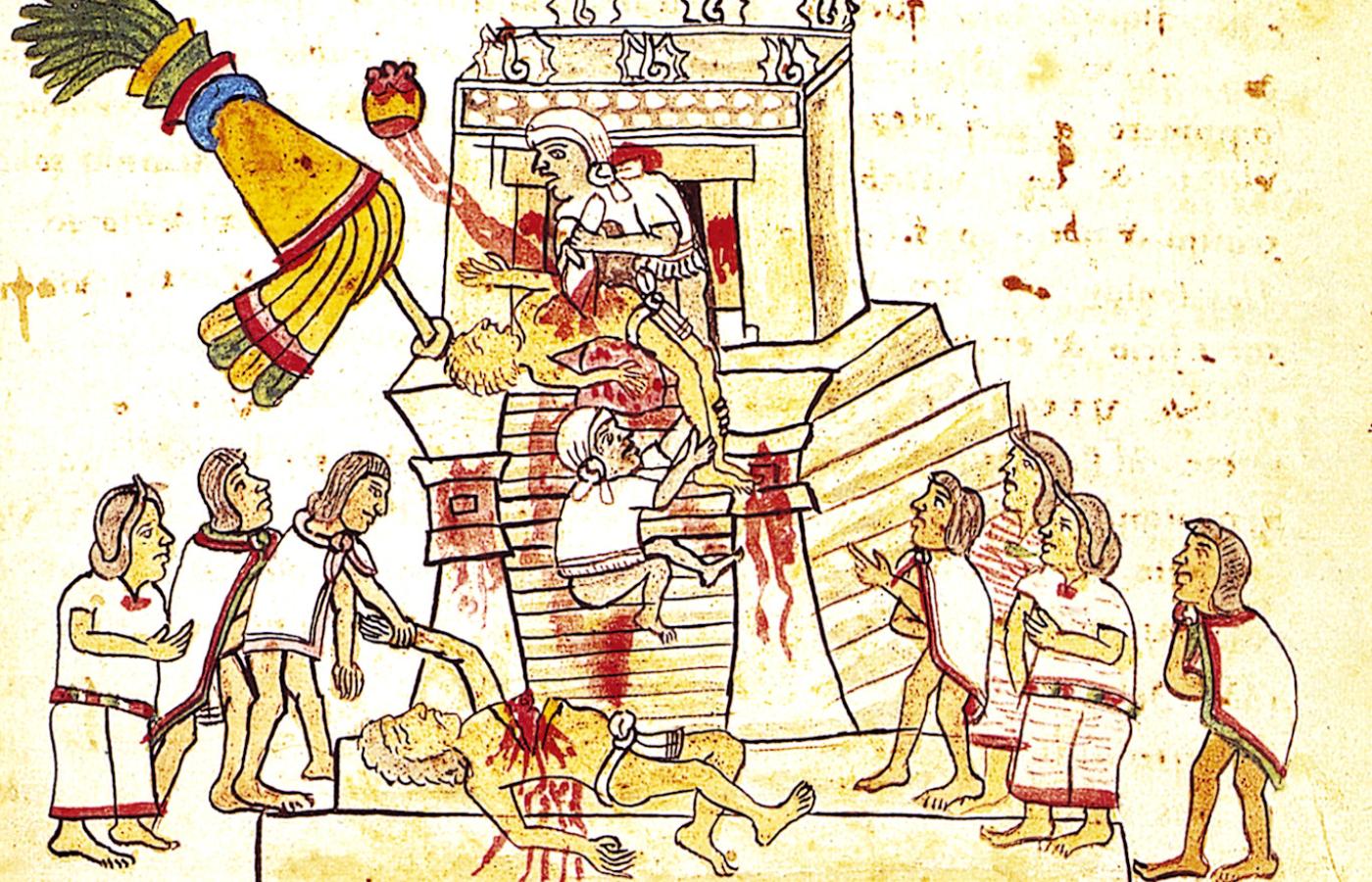 Wokół roztaczał się zapach palonej żywicy i świeżej krwi. Młodzi mężczyźni przy dźwiękach fletów z kości i bębnów wspinali się po 114 schodach na szczyt piramidy w Tenochtitlan. Ich ciała pomalowane były w czerwone pasy. Na szczycie czekali na nich przystrojeni w barwne pióra i umazani krwią kapłani. Czterech pomocników chwytało kolejno wybrańców i rozciągało na wąskim ołtarzu. Główny kapłan obsydianowym nożem rozcinał klatkę piersiową i wyjmował bijące jeszcze serce. Narząd ten wkładano do cuauhxicalli – misy orła, stojącej przed kaplicą boga. Krew zbierano do kielicha ozdobionego ludzką czaszką i przez trzcinową rurkę „karmiono” nią posąg boga. Ciało ofiary strącane kopniakiem spadało bezwładnie w dół, zostawiając na stopniach krwawy ślad. Stojący na dole kapłani odcinali nogi i ręce, które potem rytualnie zjadali. Resztę rzucano na pożarcie dzikim zwierzętom. Ceremonii przyglądały się tłumy odświętnie ubranych mieszkańców azteckiej stolicy.