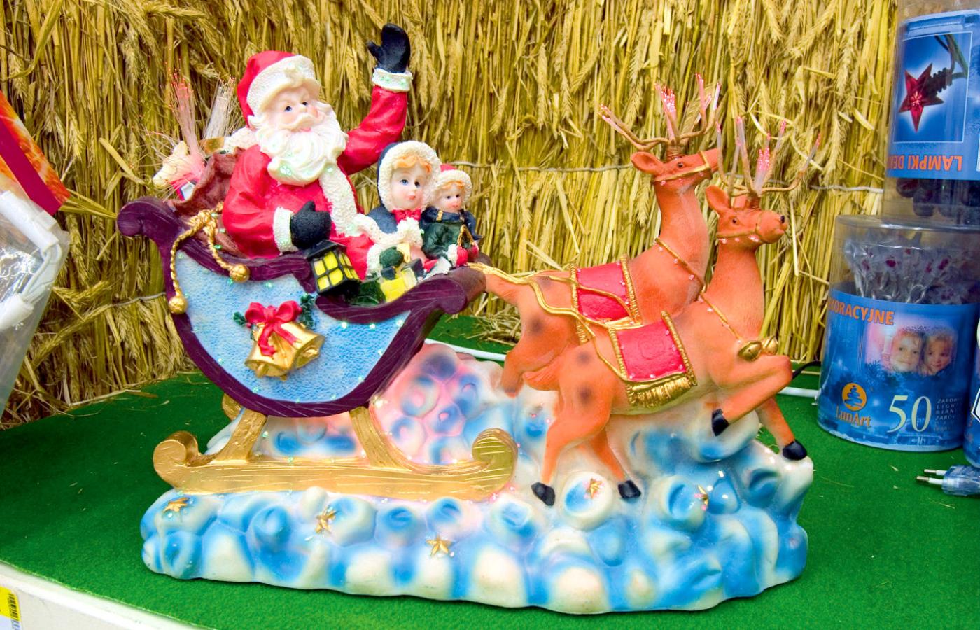 Gdyby nie Dzień Zmarłych, supermarkety prawdopodobnie zaczęłyby mrugać bożonarodzeniowo już w październiku. A tak dopiero w święto 11 listopada, gdy trzeba sklepy pozamykać, można je spokojnie wystroić. Porozwieszano więc kilometry świerkowych girland z lampami (a także łańcuchami, koralami i perełkami, bombkami i aniołami). Podczepiono wianki, kule i stroiki świetlne. Porozstawiano też plastikowe choinki kanadyjskie, kryształowe i skandynawskie sztucznie ośnieżone. Sztuczne drzewa wewnątrz marketów i prawdziwe na zewnątrz przystrojono wężami świetlnymi. Z tysiącami żarówek, które mrugają, pulsują, falują.