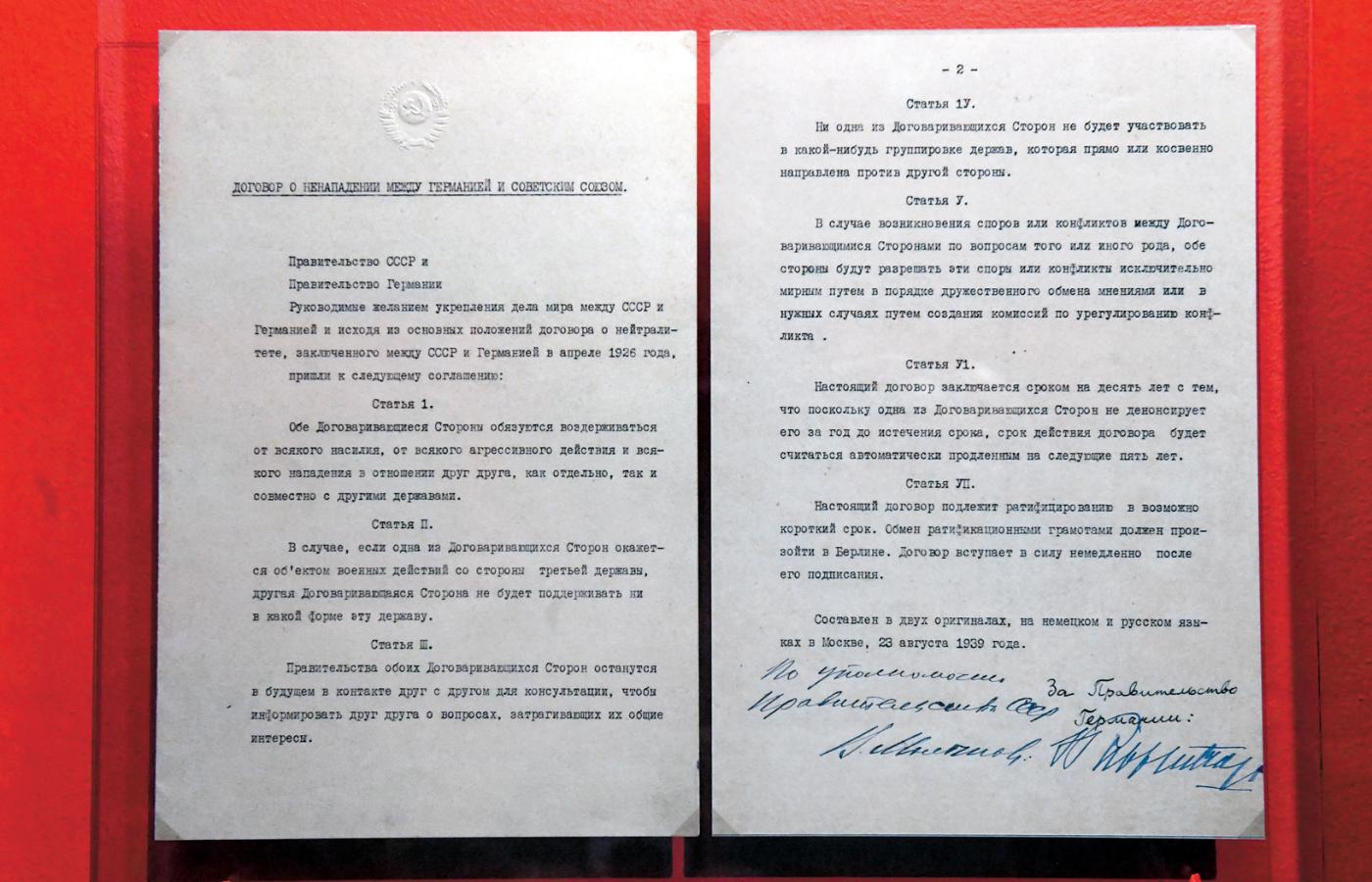 W niepamięć odeszły czasy, kiedy o pakcie o nieagresji, zawartym pomiędzy III Rzeszą a ZSRR, oraz jego tajnym protokole na lekcjach historii w Rosji nie mówiło się wcale. Jednak jego ocena, chociaż 23 sierpnia od jego podpisania minęło już 80 lat, wciąż dla wielu Rosjan jest kwestią sporną. Przekonałam się o tym wielokrotnie, słysząc od swoich co dowcipniejszych rozmówców w Rosji: „W żadnym wypadku niech ci się nie zdarzy tu powiedzieć, że ZSRR napadł na Polskę”. Co też oczywiście przy każdej okazji robiłam, póki nie zrozumiałam, że w większości przypadków przyjdzie mi wysłuchać nerwowej tyrady, którą można streścić w kilku słowach: „to wszystko nie do końca tak, jak się wydaje”. Dokładnie takie same odczucia można mieć podczas oglądania wystawy, od samego początku budzącej wątpliwości, choćby ze względu na patronów, wśród których znalazły się np. prorządowe media.