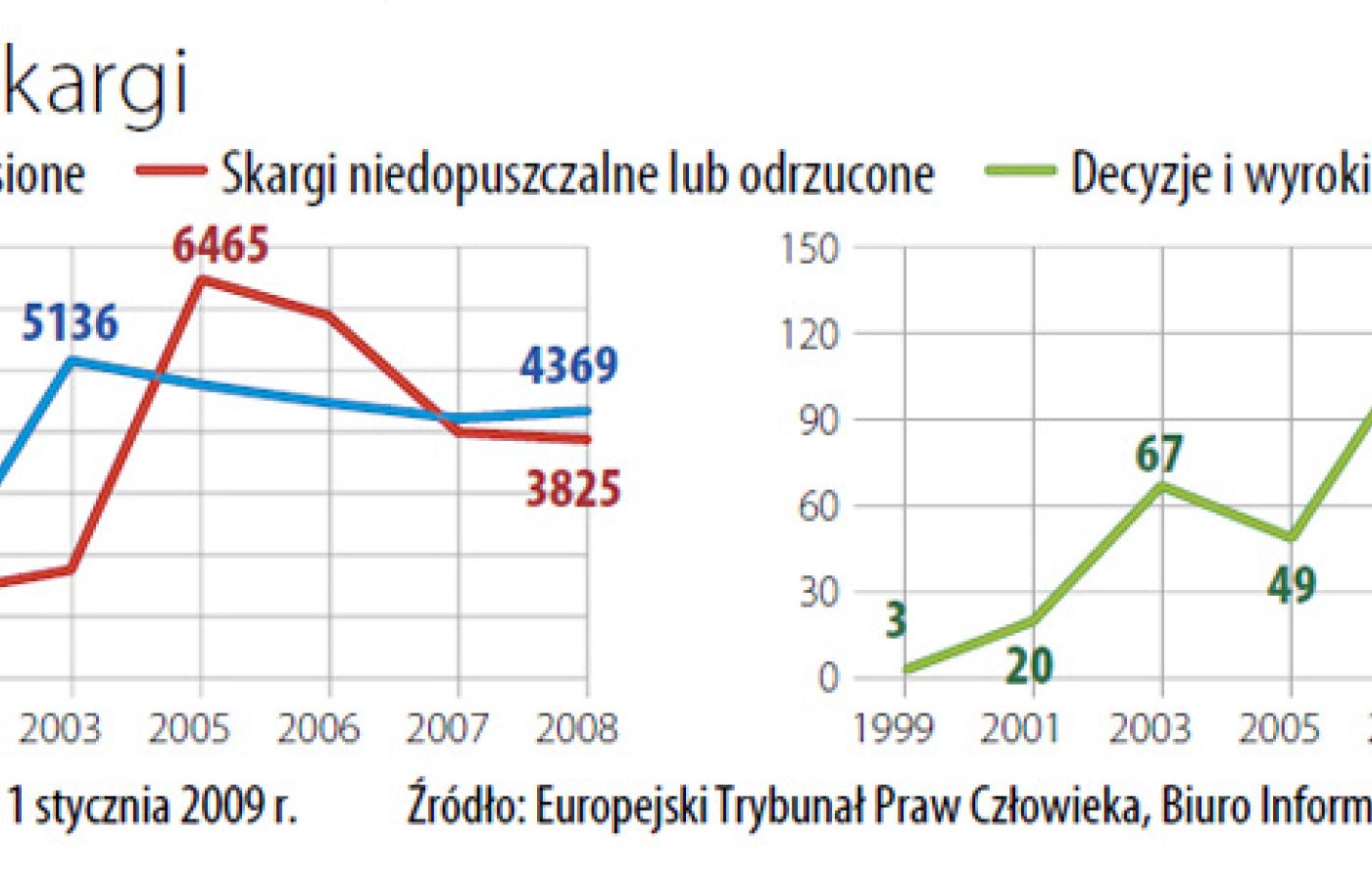 Od momentu ratyfikowania Konwencji Polacy zgłosili do Trybunału w Strasburgu ponad 34 tys. spraw. To nam daje drugie miejsce po Rosji. Jeśli brać pod uwagę liczbę rozpatrywanych obecnie spraw, jesteśmy na szóstym miejscu, wyprzedzani m.in. przez Rosję, Turcję i Ukrainę. Większość skarg jest odrzucana, bo nie spełnia podstawowych warunków formalnych (minęły terminy lub ścieżka krajowa nie została wyczerpana). Tylko 7 proc. Polaków korzysta z pomocy prawnej przy składaniu wniosków. Tak czy inaczej, Trybunał jest u nas traktowany jako coś w rodzaju czwartej instancji.