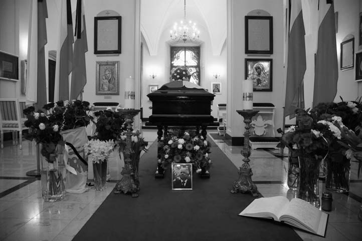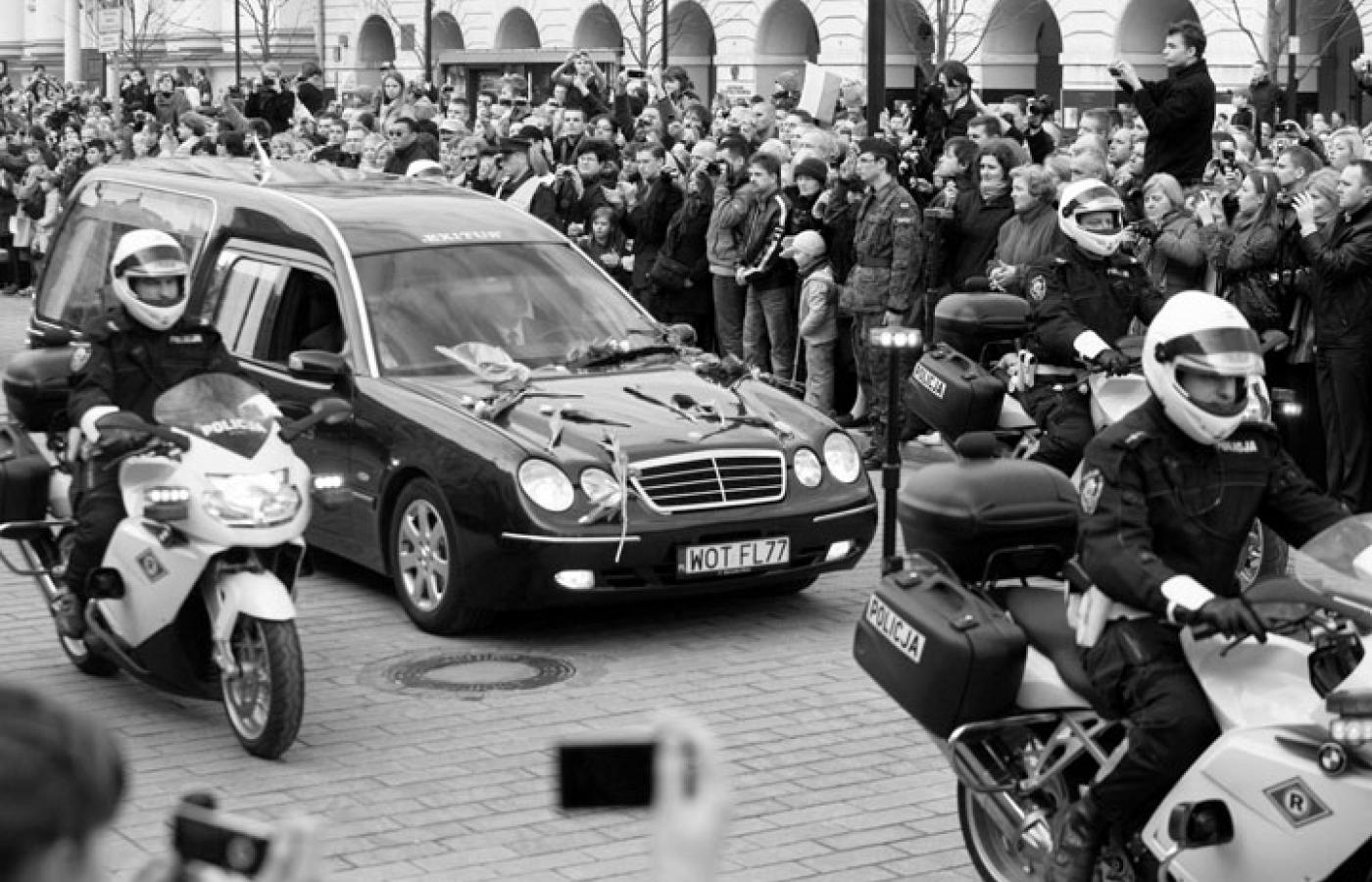Uroczystość żałobna z udziałem rodziny prezydenta i najwyższych władz państwowych odbyła się na wojskowej części lotniska Okęcie. Trumna z ciałem Lecha Kaczyńskiego została następnie przewieziona w uroczystym kondukcie ulicami Warszawy do Pałacu Prezydenckiego. Wzdłuż trasy przejazdu ustawiły się tłumy. W momencie przejazdu ludzie bili brawo i rzucali kwiaty pod koła mercedesa wiozącego ciało prezydenta. Trumnę złożono w pałacowej kaplicy, we wtorek zostanie wystawiona na widok publiczny.
