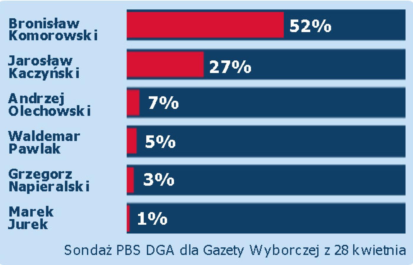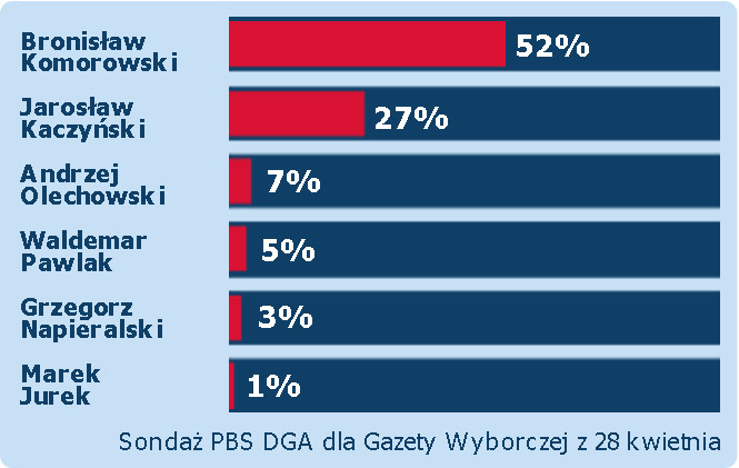 Pierwszy sondaż, który pokazuje zwycięstwo Bronisława Komorowskiego już w pierwszej turze i który potwierdza, że wybory będa tak naprawdę pojedynkiem Komorowski - Kaczyński. Dwójka ta utrzymuje ogromną przewagę nad pozostałymi pretendentami do prezydentury. Sporo do myślenia daje wynik lidera SLD Grzegorza Napieralskiego, który w sondażu PBS DGA odnotował niższe poparcie od tego, które ma Sojusz (3 proc. Napieralski, 6 proc. SLD). Oznacza to, że wyborcy lewicowi chcą głosować na innych.