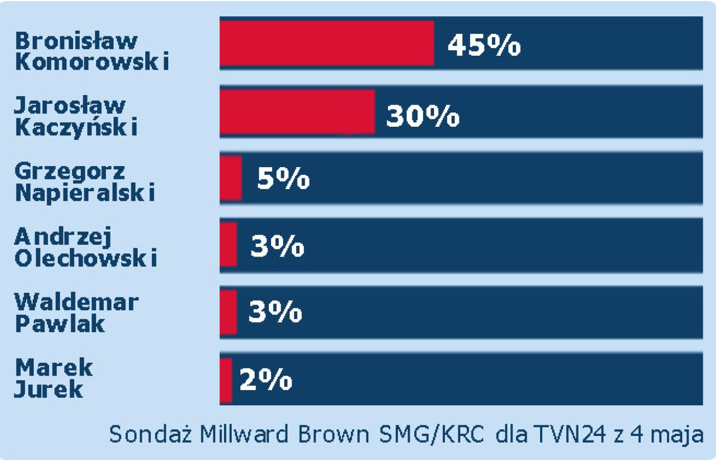 W porównaniu do poprzedniego sondażu opracowanego przez SMG/KRC dla TVN24 stratę zanotował Bronisław Komorowski (o 2 proc.). Zyskał zaś Jarosław Kaczyński (o 3 proc.). Reszta kandydatów nadal znacząco odstaje od prowadzącej dwójki. Żaden z kandydatów nawet nie zbliżył się do pułapu 10 proc.