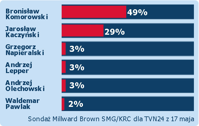 Drugie po sondażu GfK Polonia badanie, które pokazuje, że Bronisław Komorowski mimo niezbyt udanej imprezy w Łazienkach odzyskał straconą wcześniej przewagę nad Jarosławem Kaczyńskim. Konkretnie marszałek Sejmu zyskał 4 punkty procentowe, zaś prezes PiS stracił pięć. Powiększa się też przewaga Komorowskiego w ewentualnej drugiej turze, która wynosi obecnie 55 proc. do 33. Coraz bardziej zażarty pojedynek między prowadzącą dwójką doprowadził do tego, że sukcesywnie spada poparcie dla pozostałych kandydatów, osiagając już poziom błędu statystycznego.