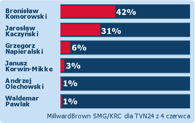 Poparcie dla Bronisława Komorowskiego spadło do poziomu najniższego od dwóch miesięcy. Na marszałka Sejmu chce głosować 42 proc. Polaków, aż o cztery procent mniej niż przed niespełna tygodniem, gdy SMG/KRC przeprowadziło poprzednie badanie. Zyskał za to Jarosław Kaczyński, który ma już 31 procentowe poparcie (czyli o jeden punkt procenowy większe niż w poprzednim sondażu SMG/KRC). Po okresie wzrostu notowań, spadek zaliczył Grzegorz Napieralski. Na szefa SLD chce głosować 6 proc. wyborców. Bardzo źle znów wypadł lider PSL Waldemar Pawlak i niezależny Andrzej Olechowski, którzy mogą liczyć na zaledwie 1 procentowe poparcie - trzy razy mniejsze od tego, jakim cieszy się Janusz Korwin-Mikke.