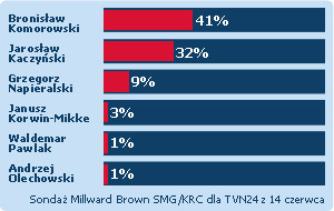 Na niekorzyść marszałka Sejmu zmienia się również sytuacja w II turze. O ile do tej pory Komorowski utrzymywał stały dystans do prezesa PiS, to w ciągu trzech ostatnich dni zmalał on aż o siedem punktów procentowych. Obecny wynik to 52 do 38 proc.
