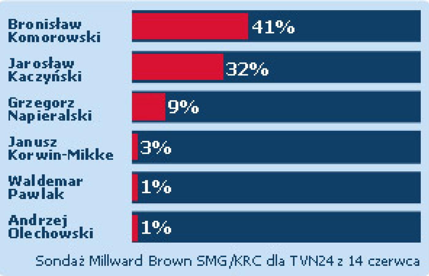 Czy na ostatniej prostej Bronisław Komorowski pozwoli sobie wydrzeć zwycięstwo? Faktem jest, że jego przewaga nad Jarosławem Kaczyńskim niknie w oczach. W ciągu trzech dni kandydat Platformy Obywatelskiej stracił trzy punkty procentowe. Jak zacięta toczy się między nimi walka o głosy wyborców świadczy pośrednio to, co dzieje się za ich plecami. O ile poparcie dla Grzegorza Napieralskiego nie drgnęło, o tyle dramatycznie wręcz zmalała grupa chętnych do głosowania na polityków o zbliżonych poglądach do prowadzącej dwójki. Na Andrzeja Olechowskiego i Waldemara Pawlaka zamierza głosować tylko po jednym procencie wyborców.