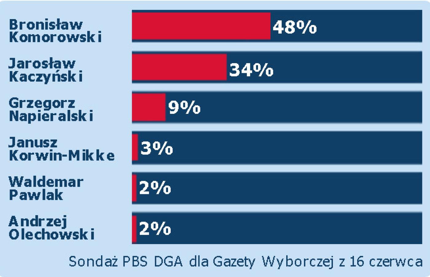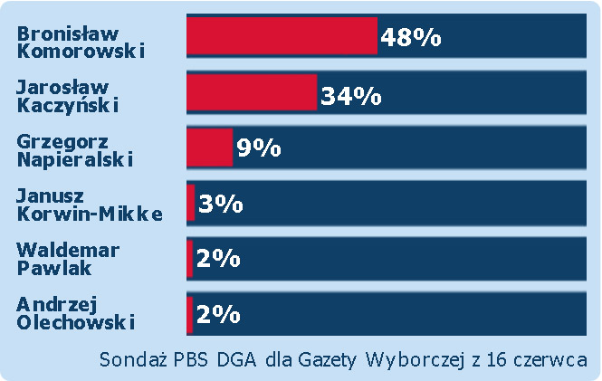 Wyniki sondażu mocno się różnią od ostatnich, publikowanych chociażby przez telewizję TVN24. Przede wszystkim zwraca uwagę znacznie większa niż w innych badaniach przewaga Bronisława Komorowskiego nad Jarosławem Kaczyńskim (choć notowania obu nieznacznie spadają). W sondażu przygotowanym dla "Gazety Wyborczej" marszałek Sejmu prowadzi nad prezesem PiS 48 do 34 proc., co oznaczałoby, że wciąż ma realne szanse na zwycięstwo w I turze. W przypadku innych kandydatów nie ma większych różnic w porównaniu do innych badań.