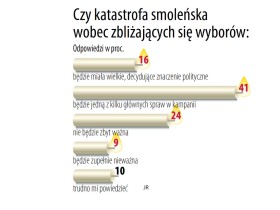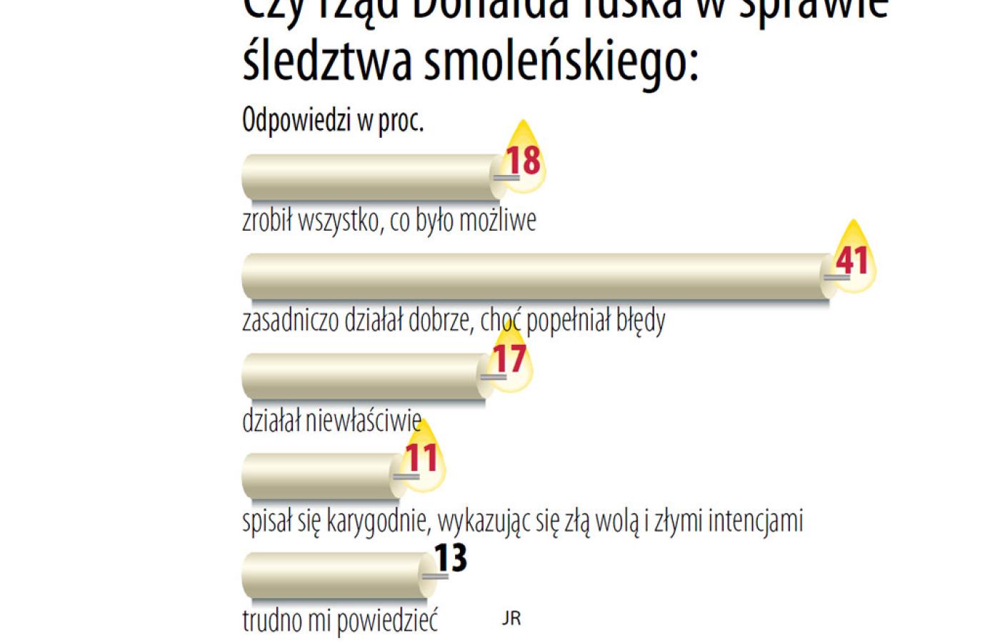 A tak nie jest. Aż 41 proc. zapytanych Polaków uważa, że rząd „działał zasadniczo dobrze, choć popełniał błędy”, a 18 proc. sądzi wręcz, że „zrobił wszystko, co było możliwe”. Tylko 11 proc. zgodziło się z odpowiedzią, że rząd „spisał się karygodnie, wykazując się złą wolą i intencjami”. Z dużym prawdopodobieństwem można przyjąć, że to z grubsza ci sami, którzy są przekonani, że doszło do zamachu. Oczywiste wydaje się za to – w świetle ogromnego propagandowego nagłośnienia sprawy – że aż 41 proc. respondentów sondażu sądzi, że katastrofa smoleńska będzie „jedną z głównych spraw w nadchodzącej kampanii wyborczej”. Dla 16 proc. będzie miała „wielkie, decydujące znaczenie polityczne”. Choć zarysowuje się druga flanka: według 33 proc. kwestia ta nie będzie zbyt ważna albo wręcz zupełnie nieważna.