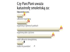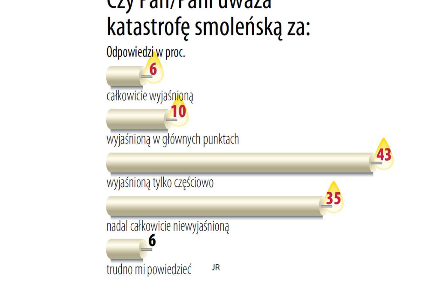 Nasz sondaż pokazuje jednak, że chociaż wersja zamachu się specjalnie nie przyjęła, to jednak w sporej mierze przeniknęła do społeczeństwa wersja lansowana przede wszystkim przez środowisko PiS. Blisko 20 proc. respondentów uważa, że główną przyczyną katastrofy były błędy strony polskiej w przygotowaniu lotu, a 24 proc. obciąża przede wszystkim rosyjską obsługę lotniska. Tylko 14 proc. pytanych uważa, że głównym powodem wypadku były błędy załogi samolotu. Wygląda na to, że decyzja pilota, aby lądować przy braku widoczności, w oczach Polaków ma mniejsze znaczenie od poczynań wieży kontroli lotów czy zaniedbań wynikłych jeszcze przed odlotem Tupolewa. Jest niemal pewne, że na takie poglądy zasadniczy wpływ miał raport MAK i pokazanie go w Polsce jako policzek dla kraju, wdeptanie w błoto państwa itd. Nieuwzględnienie w rosyjskim raporcie w najmniejszym nawet stopniu błędów kontrolerów na Siewiernym spowodowało, że Polacy stosunkowo najliczniej wskazują właśnie wieżę jako głównych sprawców smoleńskiej tragedii. Ale uderza też bardzo duży odsetek (35 proc.) tych, którzy nie mają wyrobionego zdania w kwestiach przyczyny katastrofy, wybierają, na swój sposób uczciwie, opcję „trudno powiedzieć”.