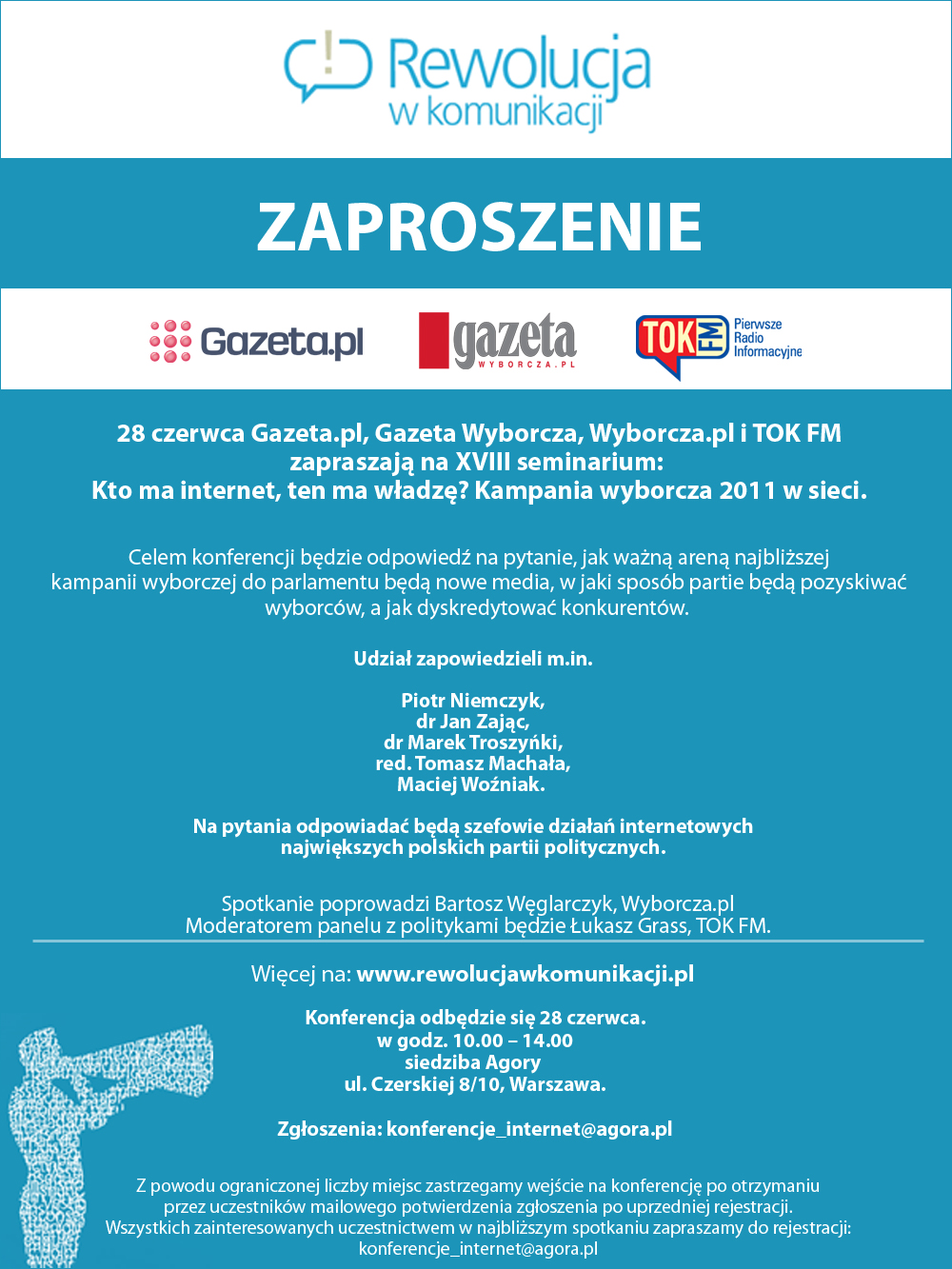 Seminarium rozpocznie się 28. czerwca br. o godz. 10:00, w siedzibie spółki Agora przy ul. Czerskiej 8/10, w Warszawie. Organizatorzy zapraszają wszystkich zainteresowanych, ale z powodu ograniczonej liczby miejsc proszą o rejestrację pod adresem: konferencje_internet@agora.pl.