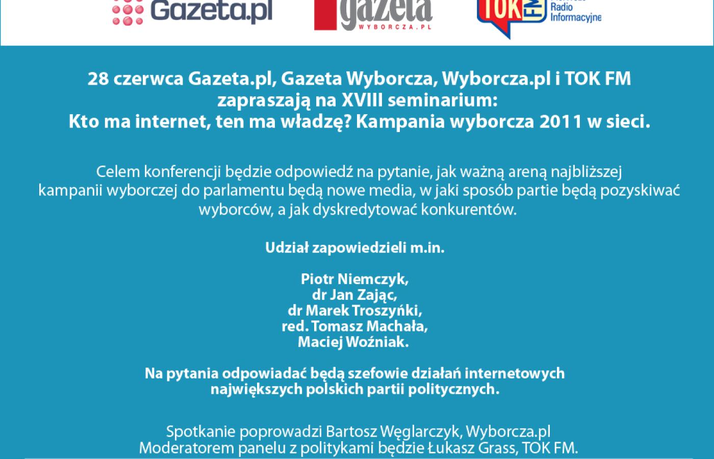 Na najbliższym semiarium z cyklu „Rewolucja w komunikacji”, które odbędzie się 28 czerwca br., eksperci omówią rolę nowych mediów w kampaniach wyborczych, ze szczególnym uwzględnieniem najbliższych wyborów. Podczas spotkania przeanalizowane zostaną m.in. strategie pozyskiwania przez partie wyborców i sposoby dyskredytowania konkurencji. Zagadnienia te omówią również szefowie działań internetowych największych polskich partii politycznych. W spotkaniu udział wezmą m. in.: Piotr Niemczyk, dr Jan Zając, dr Marek Troszyński oraz Maciej Woźniak. W panelu uczestniczyć będą: red. Tomasz Machała, Agnieszka Pomaska, Michał Kamiński, Łukasz Naczas i Rafał Trzaskowski. Dyskusję poprowadzą dziennikarze Wyborcza.pl oraz Radia TOK FM.