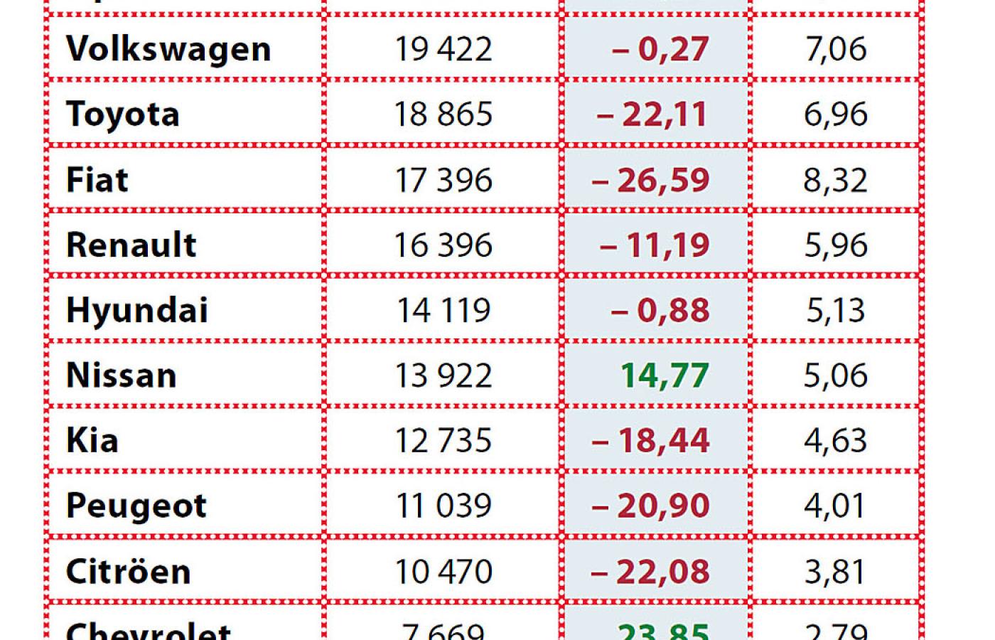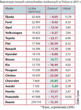 Liderem jest Škoda, czeska marka niemieckiego koncernu Volkswagen, który odnosi wyjątkowe sukcesy. To zasługa atrakcyjnej gamy modeli, a także dobrej sytuacji na rynku niemieckim. Najważniejsze rynki są bowiem silnie związane z narodowymi markami. Niemcy z VW, Mercedesem, BMW czy Oplem (choć to firma amerykańska), Francuzi z Renault i PSA, Włosi z Fiatem. Jeśli narodowy rynek przeżywa kłopoty, jak dzieje się to we Włoszech czy Francji, odbija się to także na motoryzacji.