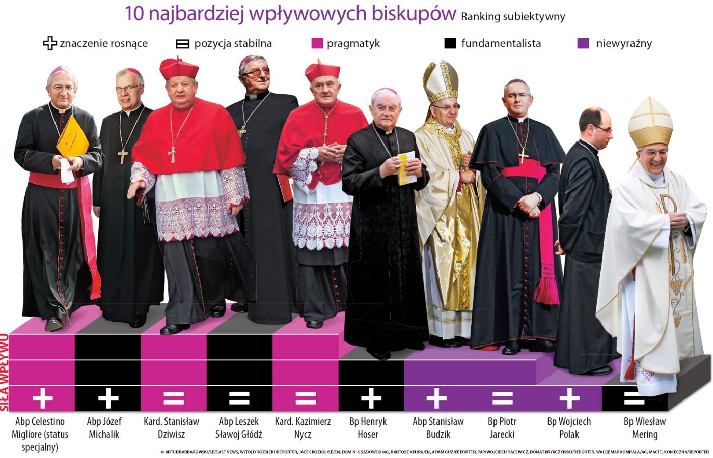 Zdaniem Makowskiego, kardynał Nycz to rzeczywiście kościelna pierwsza liga. Tylko że wciąż „nie umie on lub nie wie, jak użyć swej dużej siły i władzy w Kościele”. Według Jacka Moskwy, Nycz „wydaje się ciągle onieśmielony problemami, jakie zastał w archidiecezji warszawskiej”. To aluzja do faktu, że Nycz przez 16 lat pracował w Krakowie, a przecież w Polsce zawsze istniały dwa Kościoły: warszawski i krakowski, o różnych historiach i doświadczeniach. Na dodatek „w cieniu Nycza aż pali się do prawdziwego startu bp Piotr Jarecki, który mógłby być ważnym ogniwem w kościelnej koalicji pragmatyków”. Jarecki, doktor nauk społecznych, wspiera świecką Akcję Katolicką i udziela się m.in. w brukselskiej Komisji Konferencji Biskupów Wspólnoty Europejskiej.