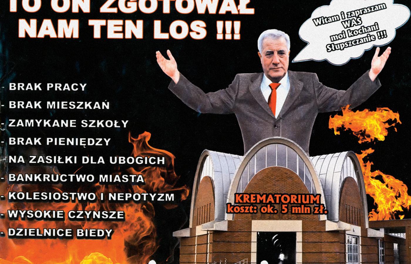 W marcu na korytarzach ratusza pojawiły się ulotki. Z fotomontażem. Nad kosztownym kaplico-krematorium góruje portret prezydenta miasta. Obok lista problemów, jakie – zdaniem autorów ulotki – gnębią miasto (brak pracy, brak mieszkań, zamykane szkoły). Podejrzenie padło na grupę osób, które zbierają podpisy o referendum, by odwołać Kobylińskiego. Lecz ci się odcinają. W urzędzie jest monitoring. – Mamy dość dobrej jakości zdjęcie z profilu mężczyzny w bejsbolówce, ale strażnicy miejscy mówili, że więcej nie pojawił się w urzędzie, więc nie było szansy go rozpoznać – relacjonuje Jacek Szuba, asystent prezydenta. Ale od czego jest aparat ścigania? 9 marca 2012 r. na stronie internetowej urzędu miasta pojawił się komunikat: „Anonimowi autorzy ulotki do swych celów wykorzystują tragedię i powagę śmierci, dają wyraz braku jakiejkolwiek kultury osobistej i dobrego smaku.