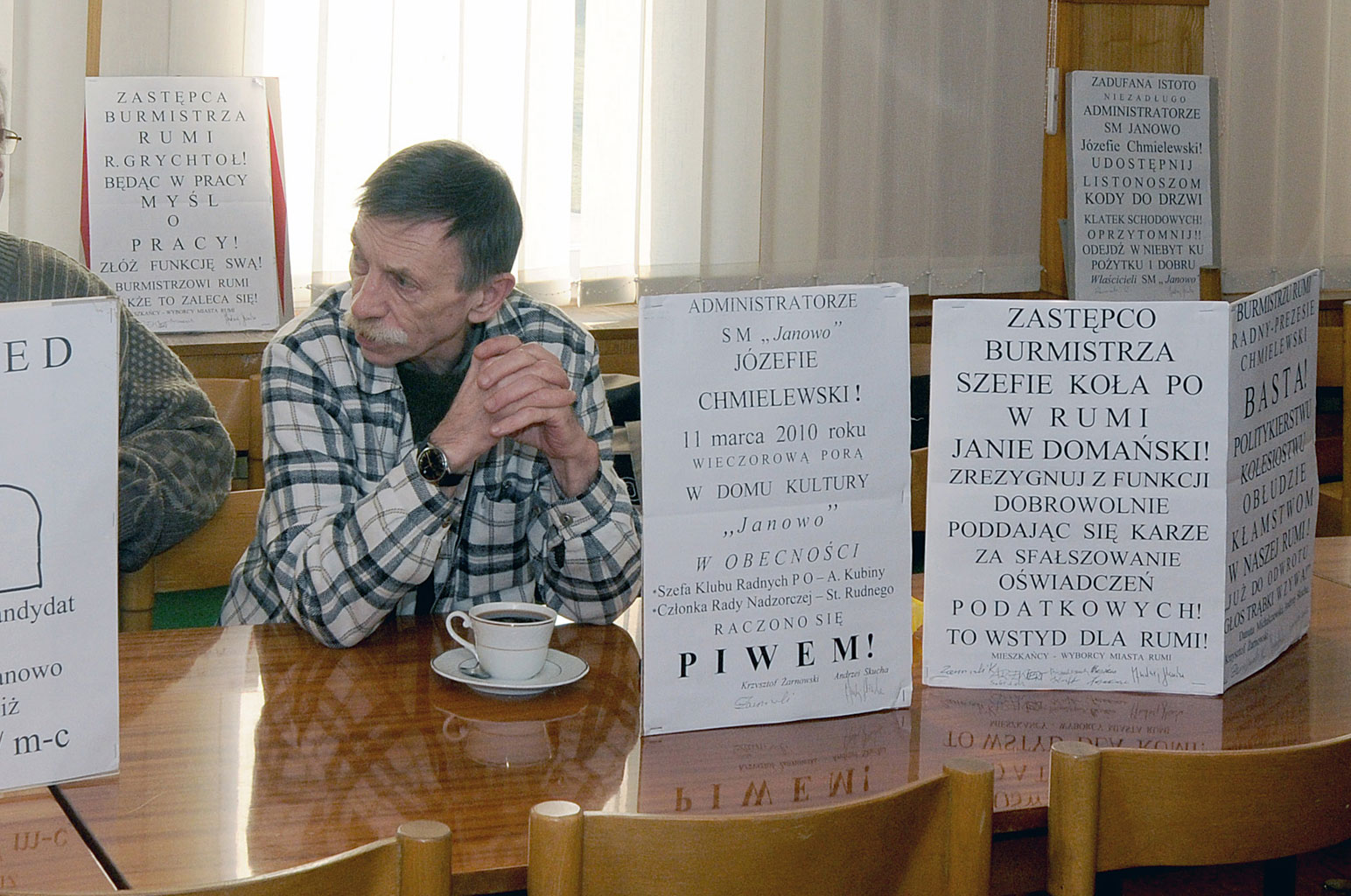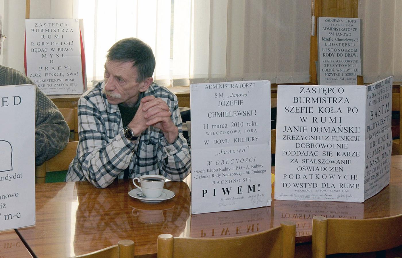W marcu na korytarzach ratusza pojawiły się ulotki. Z fotomontażem. Nad kosztownym kaplico-krematorium góruje portret prezydenta miasta. Obok lista problemów, jakie – zdaniem autorów ulotki – gnębią miasto (brak pracy, brak mieszkań, zamykane szkoły). Podejrzenie padło na grupę osób, które zbierają podpisy o referendum, by odwołać Kobylińskiego. Lecz ci się odcinają. W urzędzie jest monitoring. – Mamy dość dobrej jakości zdjęcie z profilu mężczyzny w bejsbolówce, ale strażnicy miejscy mówili, że więcej nie pojawił się w urzędzie, więc nie było szansy go rozpoznać – relacjonuje Jacek Szuba, asystent prezydenta. Ale od czego jest aparat ścigania? 9 marca 2012 r. na stronie internetowej urzędu miasta pojawił się komunikat: „Anonimowi autorzy ulotki do swych celów wykorzystują tragedię i powagę śmierci, dają wyraz braku jakiejkolwiek kultury osobistej i dobrego smaku.