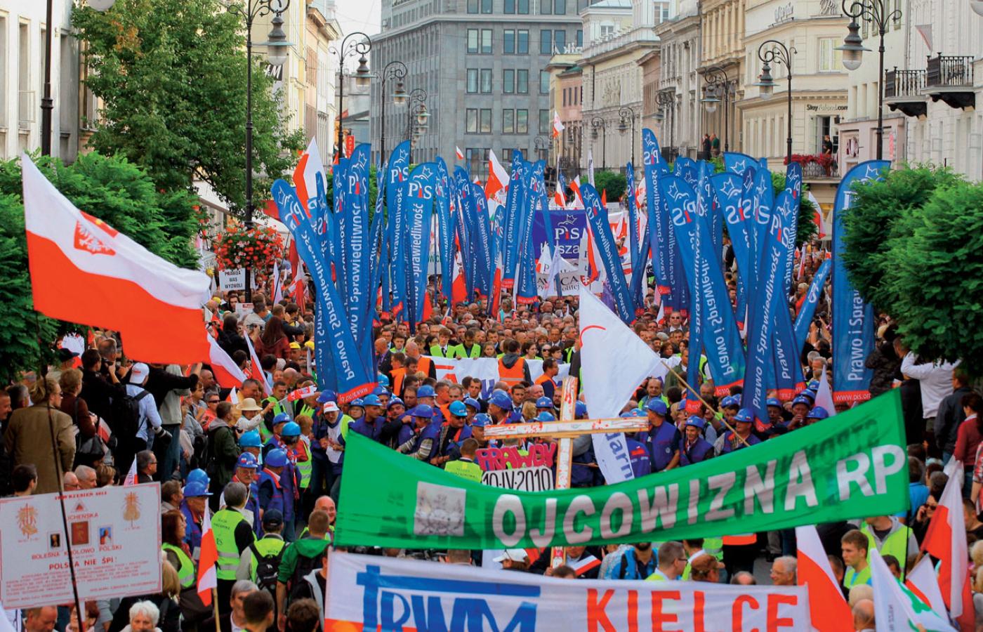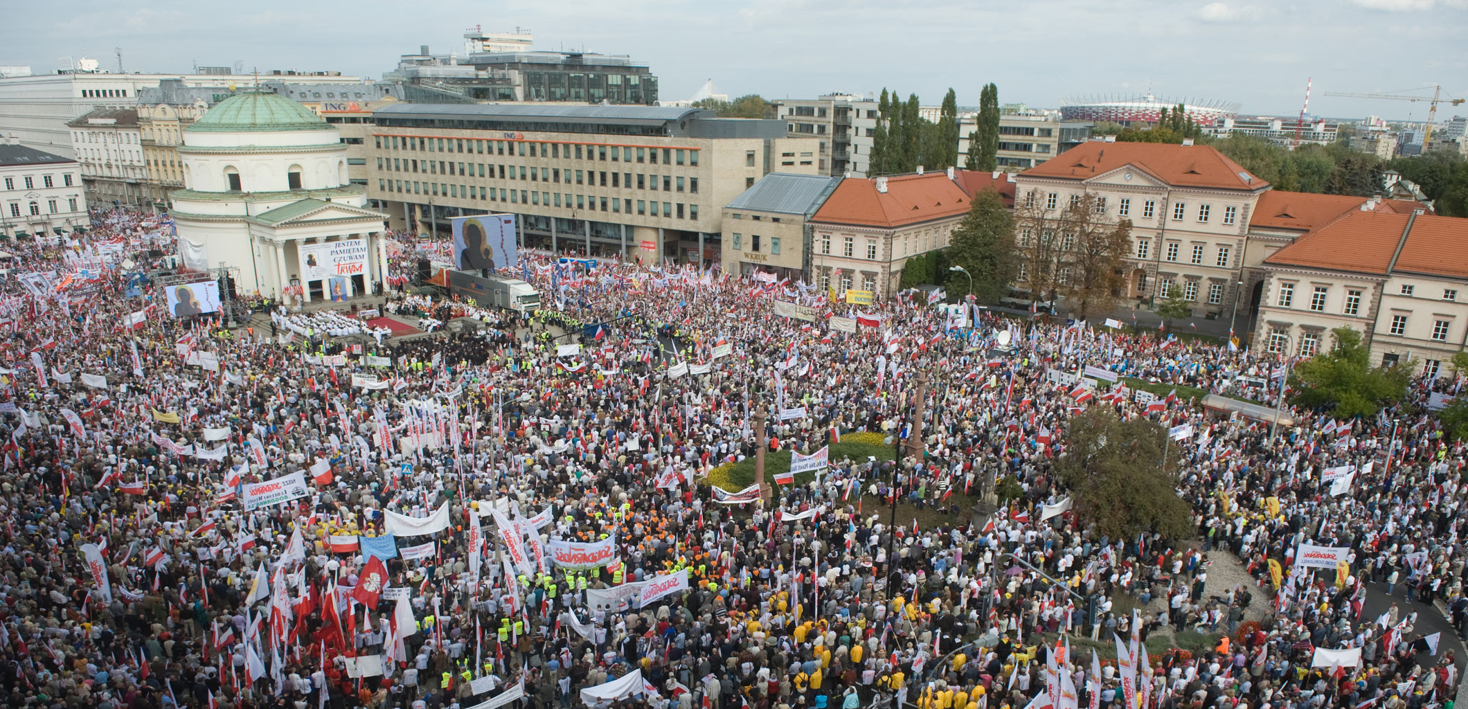 Prawe ciało skręca na prawo – nawołuje porządkowy, manifestanci właśnie formują czoło pochodu. „Tu jest Polska!” – krzyczą. Ta „Polska” ruszy za chwilę na pl. Zamkowy. Będą trąby, bębny, patriotyczne pieśni i polityczne hasła przeplatane modlitwą. „Odzyskamy Polskę dla Polaków. Odbierzemy władzę złodziejom”.