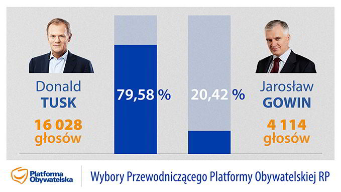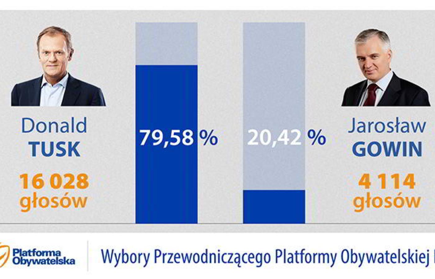 16.028 członków partii zagłosowało na Donalda Tuska, co oznacza, że otrzymał 79,58 proc. ważnych głosów.