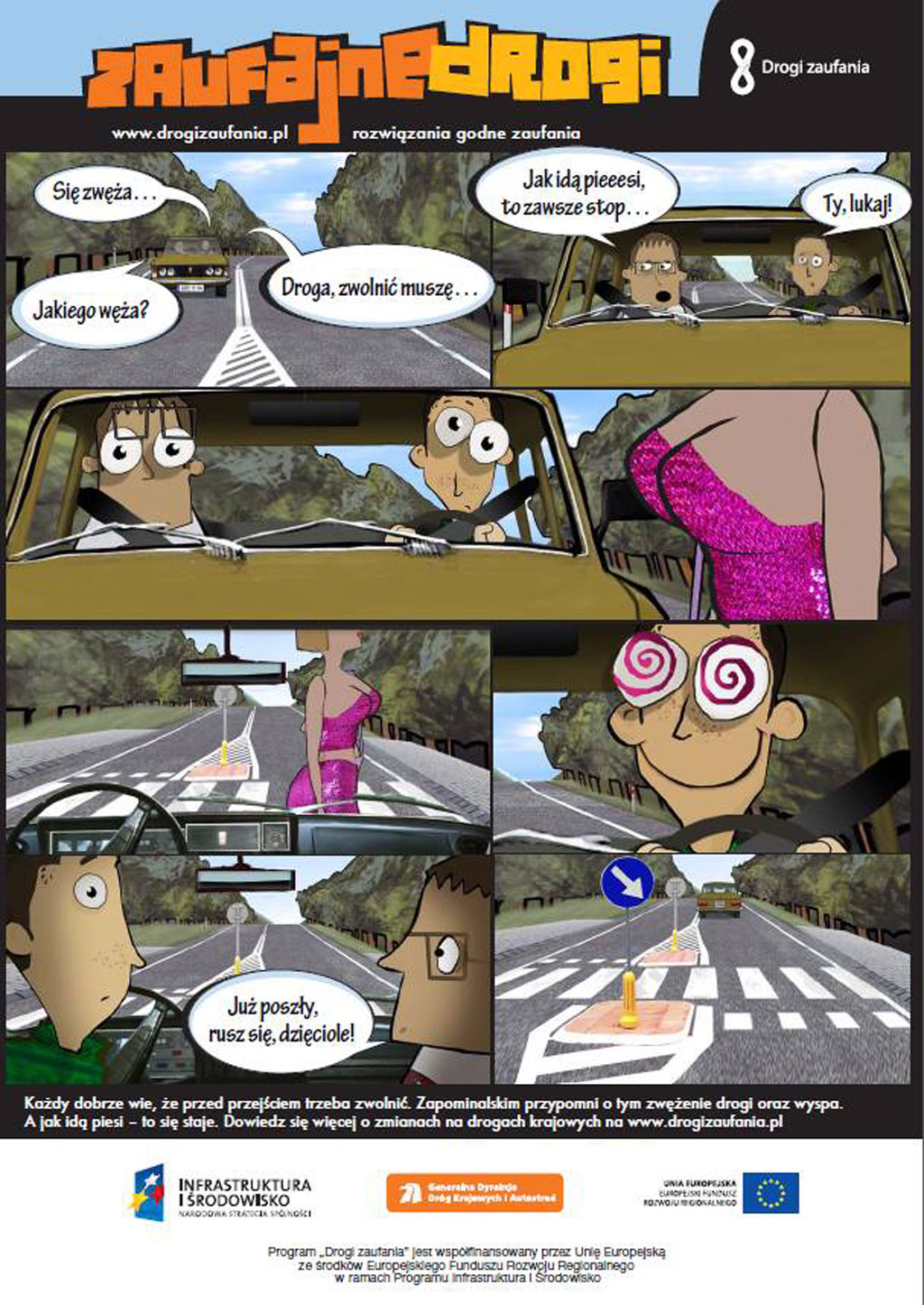 Już dawno żadna kampania społeczna nie wzbudziła tylu kontrowersji i sprzeciwów. Jej częścią są plakaty w formie komiksów i krótkie filmiki utrzymane w podobnej konwencji. Na jednym z nich widać dwóch mężczyzn kierujących autem. Gdy zbliżają się do przejścia dla pieszych, na pasach pojawia się blondynka ubrana w skąpy, różowy strój, który odsłania jej goły brzuch i wydatne piersi. Mężczyźni przykładnie się zatrzymują, a na ich twarzach widać szeroki uśmiech i oczy, które zmieniają się w dwa wielkie zakręcone lizaki. Pani przechodzi przez przejście, co mężczyźni kwitują słowami „o już przeszły” (mimo że na pasach jest tylko jedna kobieta). No i konkluzja: „ jak idą pieeesi, to zawsze stop”.