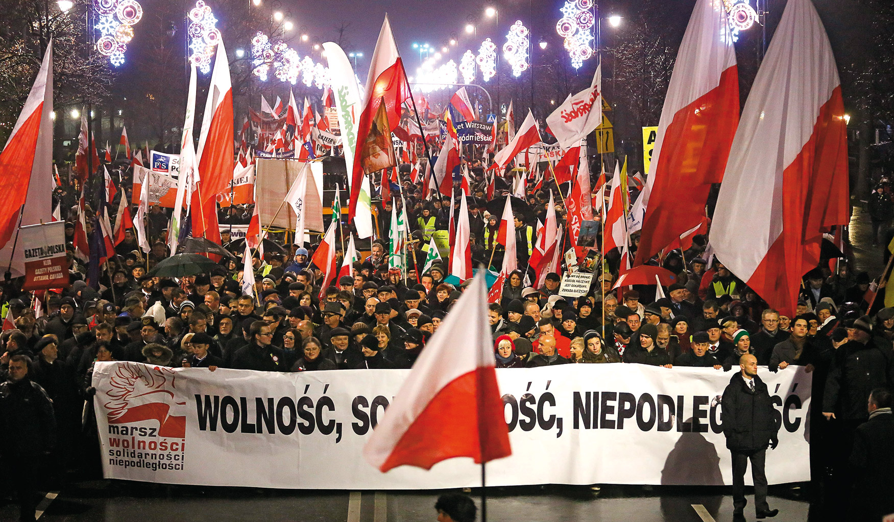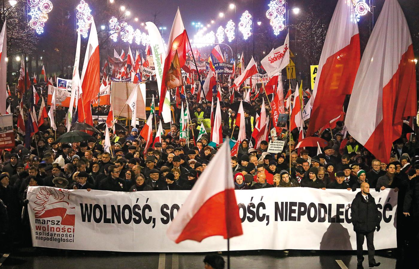 Polityczny charakter miał za to Marsz Wolności, Solidarności i Niepodległości, organizowany po raz trzeci przez środowisko PiS. 13 grudnia, w rocznicę wprowadzenia stanu wojennego, ulicami Warszawy przeszło ok. 4 tys. bojowników o wolność i prawdę, bo – jak przekonywał Jarosław Kaczyński – „wolność jest dziś na różne sposoby ograniczana”, panuje „nastrój zastraszania”, a „ludzie co innego mówią w domu, a co innego publicznie. Jak w PRL!”. Prezes nawiązał też do sytuacji na Ukrainie, wyrażając nadzieję, że wraz z Ukraińcami „wspólnie będziemy budować nowy kształt Europy”. Chyba nie wszyscy uczestnicy marszu podzielali jego euroentuzjazm, bo na transparentach pojawiły się antyunijne hasła i rysunki swastyki wpisanej we flagę Unii.