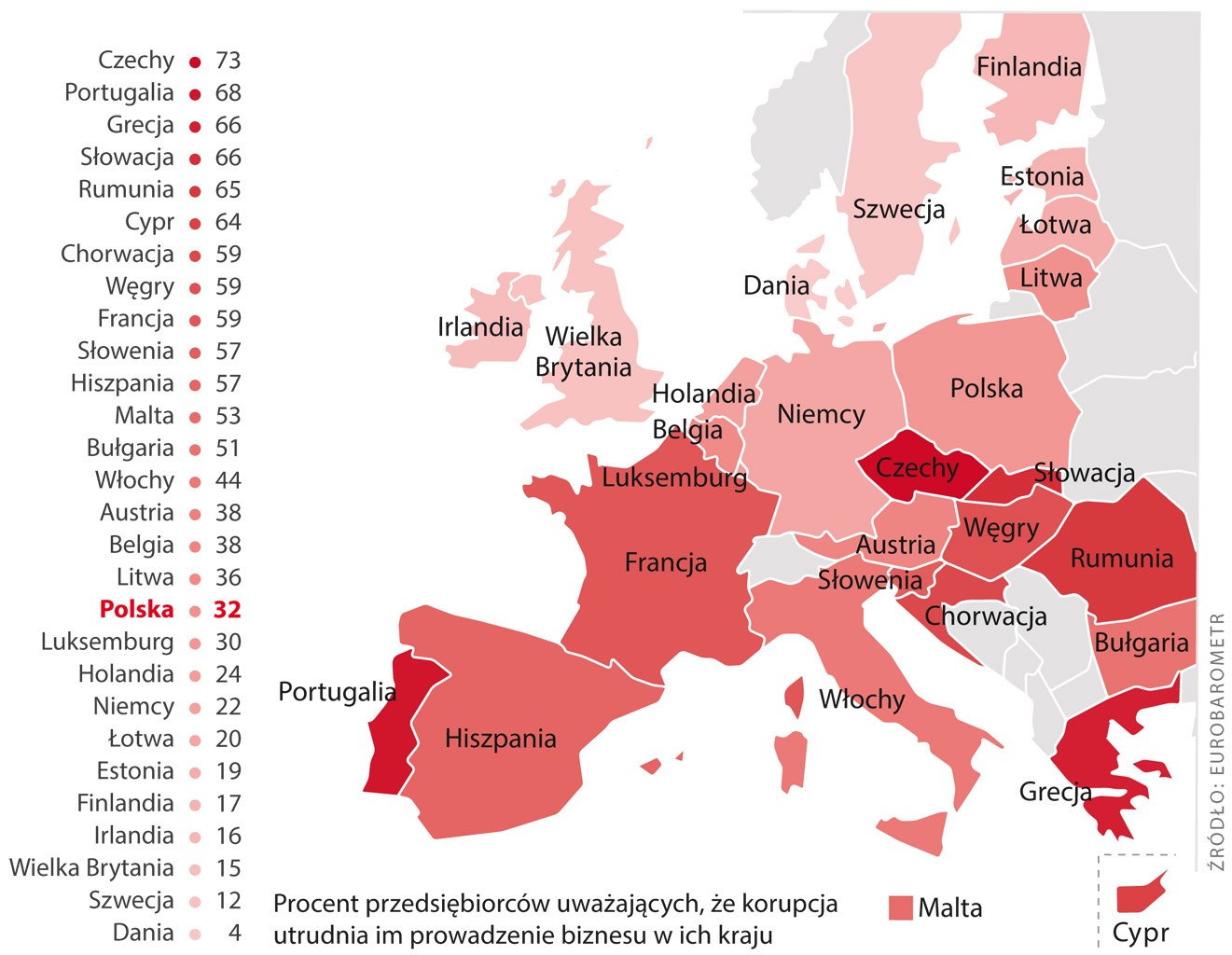 Korupcja najbardziej przeszkadza przedsiębiorcom w Czechach (73 proc. ankietowanych). Na kolejnych miejscach są Portugalczycy, Grecy, Słowacy, Rumuni i Cypryjczycy. Polscy przedsiębiorcy rzadziej narzekają na korupcję – tylko 32 proc. upatruje w niej bariery dla swojego biznesu. Lepiej niż w Polsce jest w Niemczech, Luksemburgu, Holandii, w krajach bałtyckich, Wielkiej Brytanii, Irlandii i w krajach skandynawskich; w Danii problem dostrzega tylko 4 proc. przedsiębiorców.