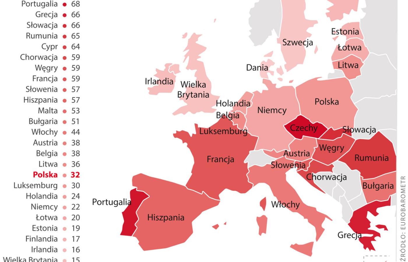 Niemal wszyscy Grecy, Hiszpanie i Włosi uważają korupcję za powszechną. Podobnego zdania jest 90 proc. przedsiębiorców w Czechach, Słowenii, Słowacji i na Węgrzech. Warto zauważyć, że te same nacje równie często mówią o korupcji jako barierze w prowadzeniu biznesu. Na drugim końcu skali są duńscy przedsiębiorcy – zaledwie 10 proc. z nich uważa, że korupcja jest powszechna. W Polsce takiego zdania jest 86 proc. przedsiębiorców. W Unii jest tylko siedem krajów, gdzie mniej niż połowa przedsiębiorców uważa korupcję za rozpowszechnioną – są to Dania, Luksemburg, Finlandia, Szwecja, Wielka Brytania, Belgia oraz Irlandia.