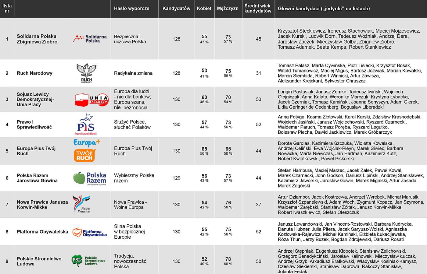 Z 1279 kandydatów niespełna połowa – 557 – to kobiety (44 proc.) Najwięcej kobiet znalazło się na listach koalicji Europa Plus Twój Ruch. Tylko ona zachowała pełny, 50-proc. parytet.130 miejsc na swoich listach podzieliła dokładnie po połowie między obie płcie.