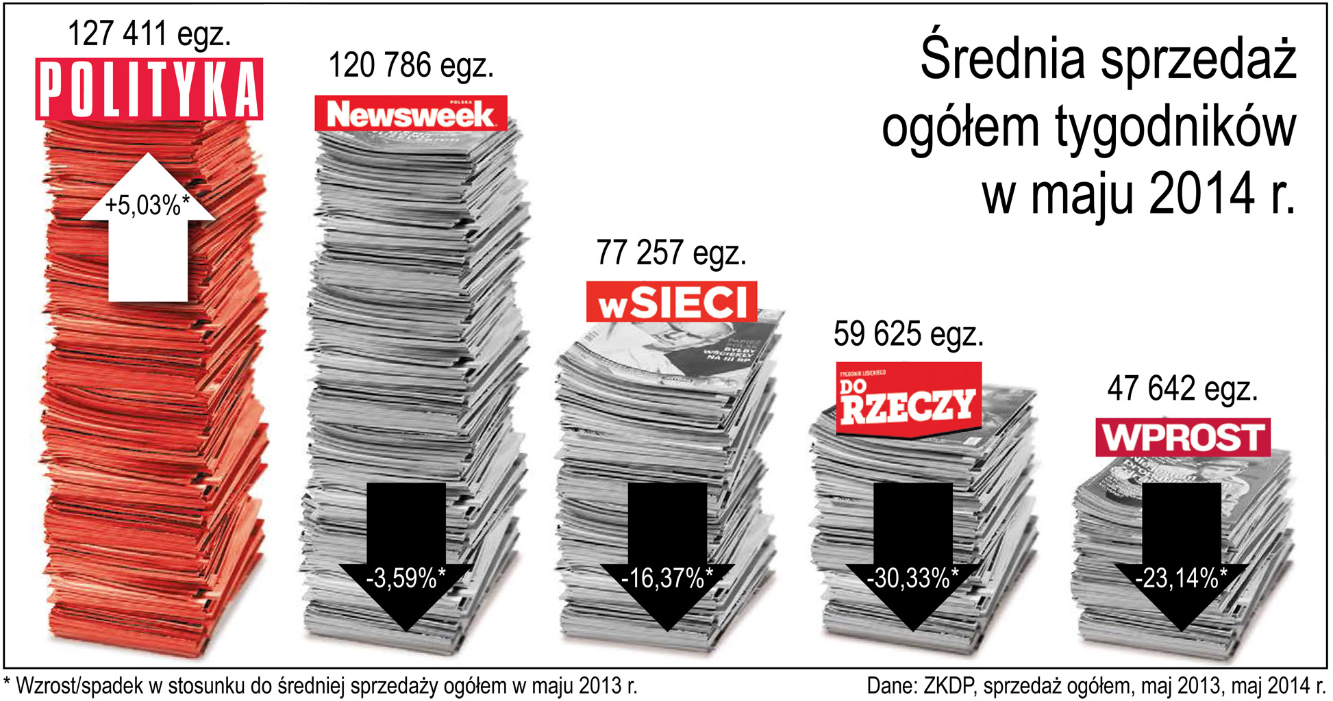 POLITYKA z wynikiem 123 tys. średnio sprzedanych egzemplarzy przewodzi też w zestawieniu sprzedaży za pierwsze pięć miesięcy 2014 r. Na drugim miejscu plasuje się „Newsweek” (121 tys. egz.), na trzecim – „wSieci” (79 tys. egz.). Poza podium lokują się „Do Rzeczy” (64 tys.