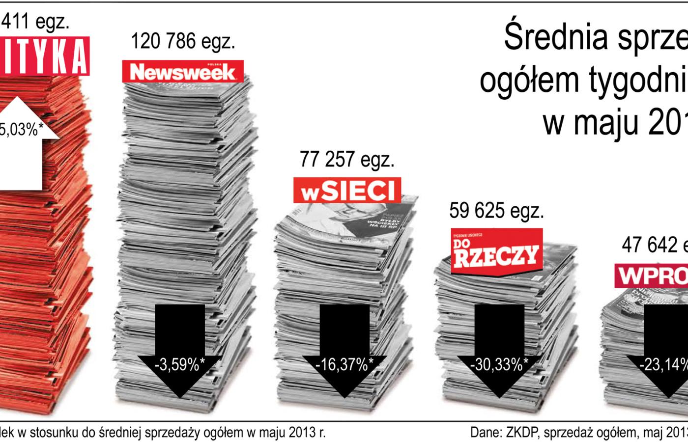 Pozostałym tygodnikom opinii nie udało się przekroczyć pułapu 80 tys. sprzedanych egzemplarzy. Tygodnik „wSieci” (ze średnią sprzedażą 77,2 tys. egzemplarzy) odnotował spadek o 16 proc. w stosunku do maja ubiegłego roku; „Do Rzeczy” (ze średnią sprzedażą 59,6 tys. egzemplarzy) – o 30 proc.; „Wprost” (ze średnią sprzedażą 47,6 tys. egzemplarzy) – o 23 proc.