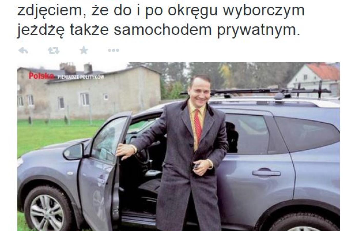 Tygodnik „Wprost” pisze, że Radosław Sikorski, który „ocenia uczciwość posłów”, sam często korzysta z prywatnego samochodu do celów służbowych. Jak wylicza tygodnik, w 2009 r. Sikorski, ówczesny minister spraw zagranicznych, pobrał z kasy Sejmu 1245 zł, ale już rok później aż 21 tys. zł. W 2011 r. wyjeździł samochodem prywatnym kilometrów za 26,5 tys. zł, a w 2012 r. pobrał 19,1 tys. zł. W zeszłym roku już niecałe 10 tys. zł.
