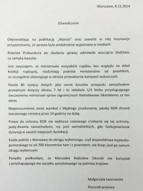 Rzeczniczka marszałka publikację „Wprost” nazwała insynuacjami. Wyjaśniała, że jest zwyczajem, że ministrowie wszystkich rządów, bez względu na skład koalicji rządzącej, rozdzielają podróże ministerialne od poselskich, co szczególnie obowiązuje w okresie prowadzenia kampanii wyborczych. Sikorski korzystał ze służbowej limuzyny z kierowcą w związku z wykonywaniem obowiązków szefa MSZ. Jednocześnie pełnił funkcję posła. Nie zawsze obowiązki posła pokrywały się z obowiązkami ministerialnymi.