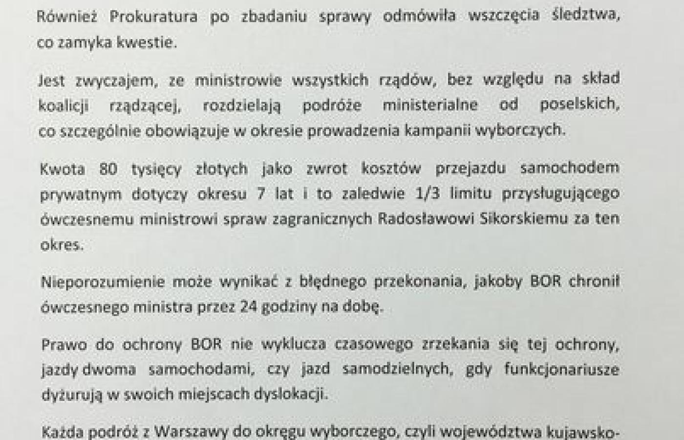 Mówiła też, że nieporozumieniem jest, że ministrowi przysługuje 24-godzinna ochrona BOR. Prawo do ochrony BOR nie wyklucza czasowego zrzeczenia się jej, również jazdy dwoma samochodami czy jazd samodzielnych. Zauważyła też, że Sikorski nie korzystał z przysługującego mu ryczałtu samolotowego na podróże krajowe.