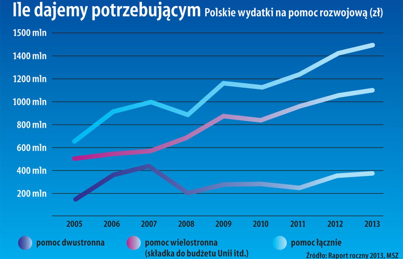 Według oficjalnych danych rządowych w 2013 r. ze środków publicznych wydano na pomoc rozwojową 1 mld 478 mln zł (patrz wykres na s. 9). To kwota, która może robić wrażenie. Z tego jednak ponad miliard złotych – trzy czwarte – to składka do budżetu „pomocowego” Unii Europejskiej oraz innych organizacji międzynarodowych. Wpadają one do wspólnego europejskiego kotła, z którego mogą czerpać także polskie organizacje niosące pomoc. Rzadko im się to jednak udaje, bo są za małe i za słabe, a więc trudno im rywalizować z zachodnimi gigantami.
