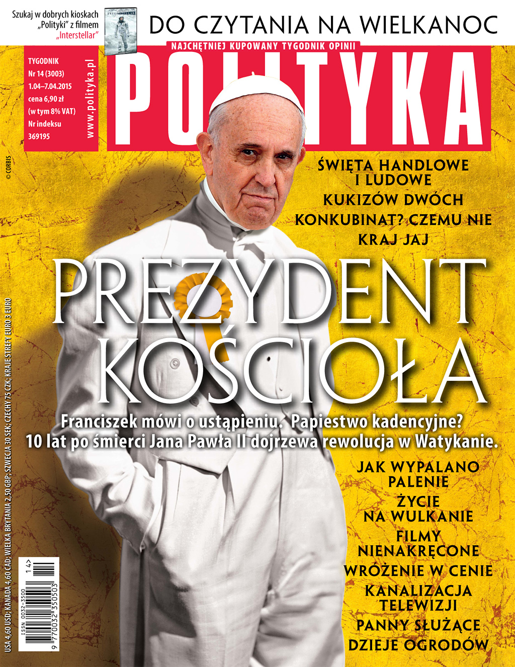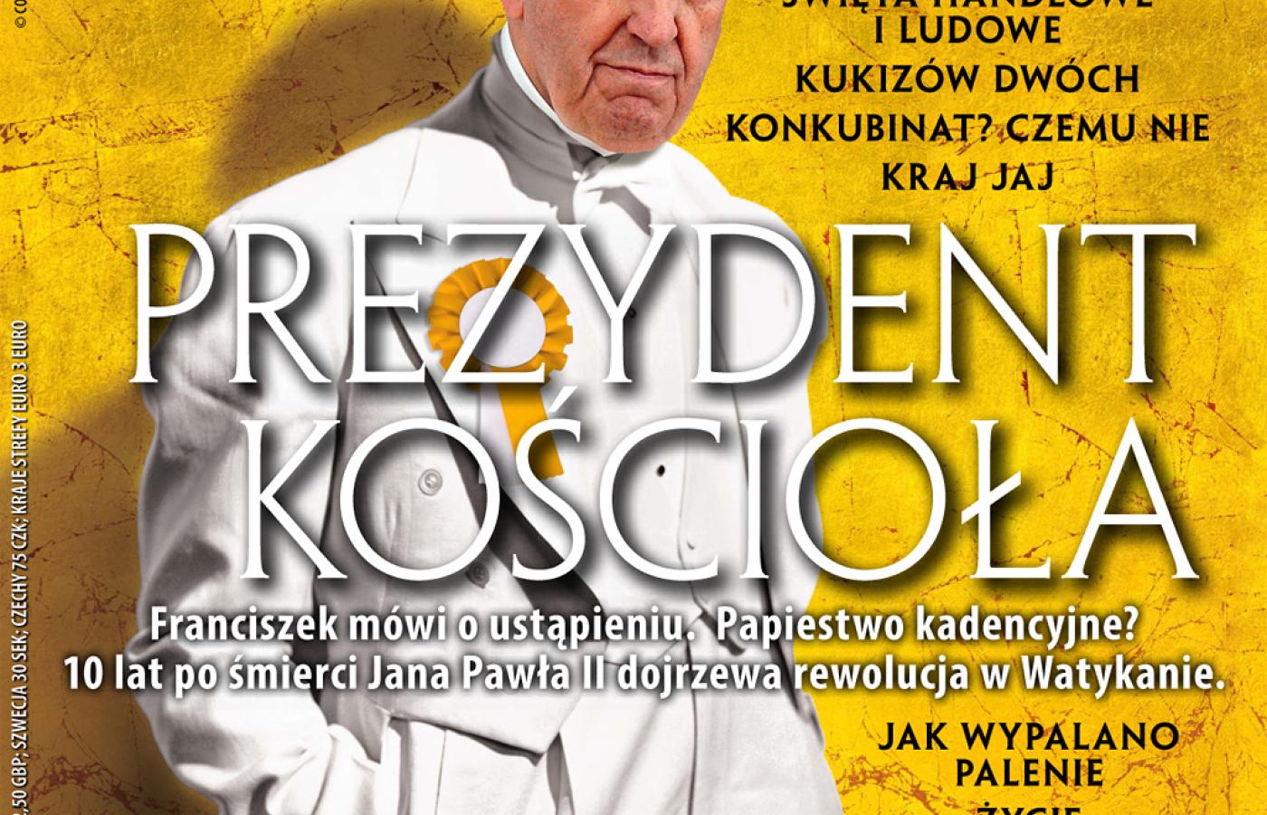 A w tygodniku aż 140 stron, z okładkowym tematem („Prezydent Kościoła”), poświęconym urzędowi papieskiemu. Preteksty są oczywiste: w 10 lat po śmierci Jana Pawła II, charyzmatycznego Ojca Kościoła, papież Franciszek sugeruje, że może to być funkcja kadencyjna. Motywy i implikacje franciszkańskiej rewolucji w artykule naszego watykanisty Adama Szostkiewicza.