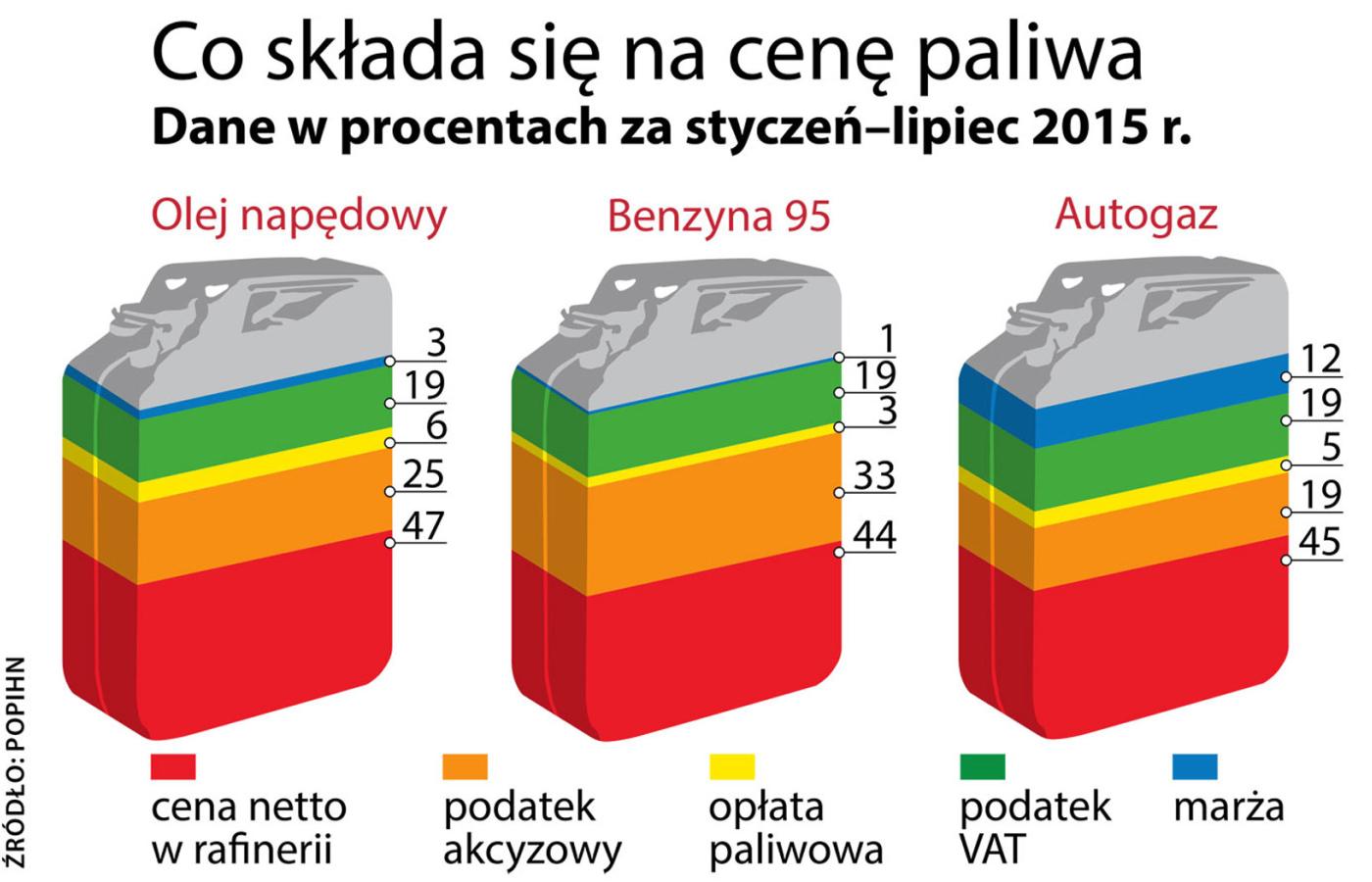 Podatki. O tym, ile płacimy przy dystrybutorze, w większym stopniu decyduje fiskus niż naftowi szejkowie. Każdy kraj ma własną politykę podatkową, do tego dokłada się Bruksela, narzucając minima akcyzowe. Ponad połowa ceny to akcyza, opłata paliwowa, VAT. Największy udział ma akcyza, która jest ustalana kwotowo, a nie procentowo. Fiskus chce w ten sposób uniknąć spadku wpływów w sytuacji spadających cen (tak jak ma to miejsce przy VAT). Koszt ropy w cenie paliwa stanowi ok. 20–30 proc. Tak więc wahania cen tego surowca mogą wpłynąć tylko na tę część naszego rachunku. Nawet gdyby rafinerie dostawały ropę za darmo, to i tak przy dystrybutorze musielibyśmy zapłacić za litr benzyny ok. 3 zł.