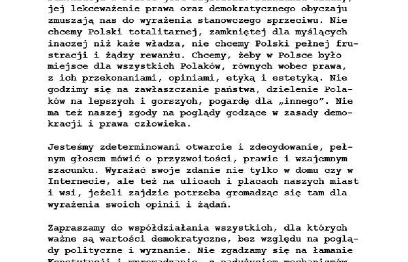 „Działania władzy, jej lekceważenie prawa oraz demokratycznego obyczaju zmuszają nas do wyrażenia stanowczego sprzeciwu. Nie chcemy Polski totalitarnej, zamkniętej dla myślących inaczej niż każe władza, nie chcemy Polski pełnej frustracji i żądzy rewanżu” – napisano w manifeście grupy. Jej założyciele chcą, żeby „w Polsce było miejsce dla wszystkich Polaków, równych wobec prawa, z ich przekonaniami, opiniami, etyką i estetyką”. Nie godzą się na zawłaszczanie państwa, dzielenie Polaków na lepszych i gorszych, pogardę dla „innego” ani też na poglądy godzące w zasady demokracji i prawa człowieka.