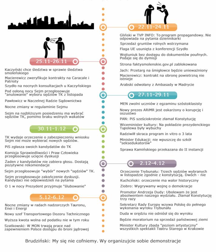 Kiedy przed dwoma tygodniami publikowaliśmy pierwszą infografikę Piotra Ciochonia, ilustrującą „dokonania” pierwszych dni rządu PiS, autor zapowiadał kolejne. Jak tłumaczył, jego pomysł był „wynikiem natłoku informacji o kolejnych jego posunięciach”. Autor doszedł do wniosku, że niedługo opinia publiczna, w tym on sam, zapomni o niektórych działaniach, bo zostaną one przesłonięte kolejnymi. – Kontrowersyjnych posunięć jest tak dużo, że ciężko się w nich nie pogubić – wyjaśniał Piotr Ciochoń.