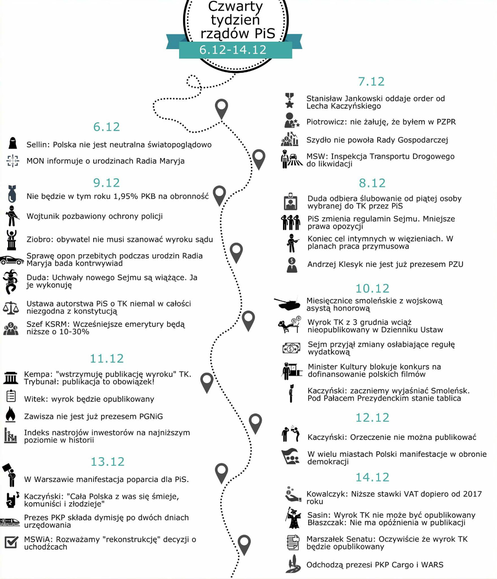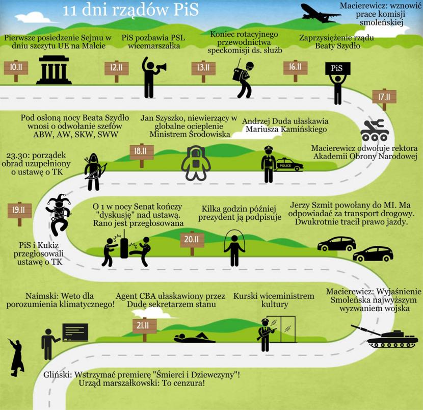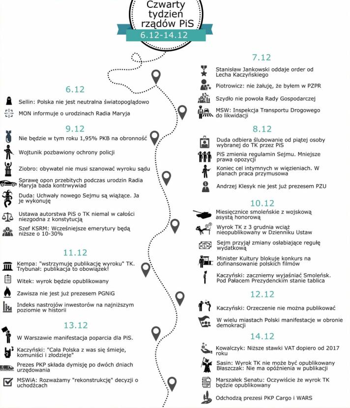 Za działaniami i decyzjami rządu PiS oraz za wypowiedziami kluczowych członków tej partii (w tym również prezesa Jarosława Kaczyńskiego) coraz trudniej nadążyć. Na życzenie naszych Czytelników usiłujemy jednak być na bieżąco. Poniższe infografiki służą nam tu niezwykłą pomocą – tak by zachować pamięć aktualnych i mijających wydarzeń. Autorem ich wszystkich jest Piotr Ciochoń.