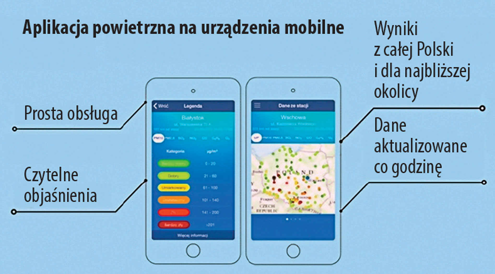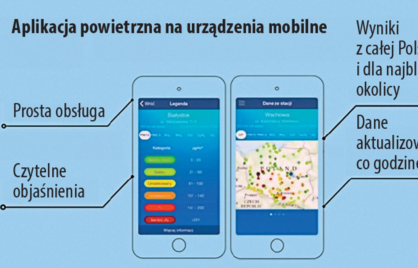 Dzięki aplikacji „Jakość powietrza w Polsce”, przygotowanej przez Główny Inspektorat Ochrony Środowiska, będzie można sprawdzić czystość powietrza w swojej okolicy. W aplikacji na urządzenia mobilne dostępne są bieżące dane ze 140 automatycznych stacji pomiarowych Państwowego Monitoringu Środowiska rozmieszczonych na terenie Polski. Aplikacja sama wybierze stację, która znajduje się najbliżej użytkownika, ale można też sprawdzić dane z pozostałych punktów pomiarowych. Wyniki pomiarów są podawane w sześciostopniowej skali (od „bardzo dobrego” do „bardzo złego”), odnoszącej się do potencjalnego wpływu zanieczyszczeń na zdrowie. Aplikację można bezpłatnie pobrać dla systemu Android (przez Google Play), a od połowy stycznia 2016 r. również dla systemu iOS (przez AppleStore). Dokładniejsze dane o jakości powietrza (w tym m.in. archiwalne wyniki pomiarów oraz ostrzeżenia o wysokich stężeniach zanieczyszczeń na terenie Polski) podaje portal www.powietrze.gios.gov.pl.