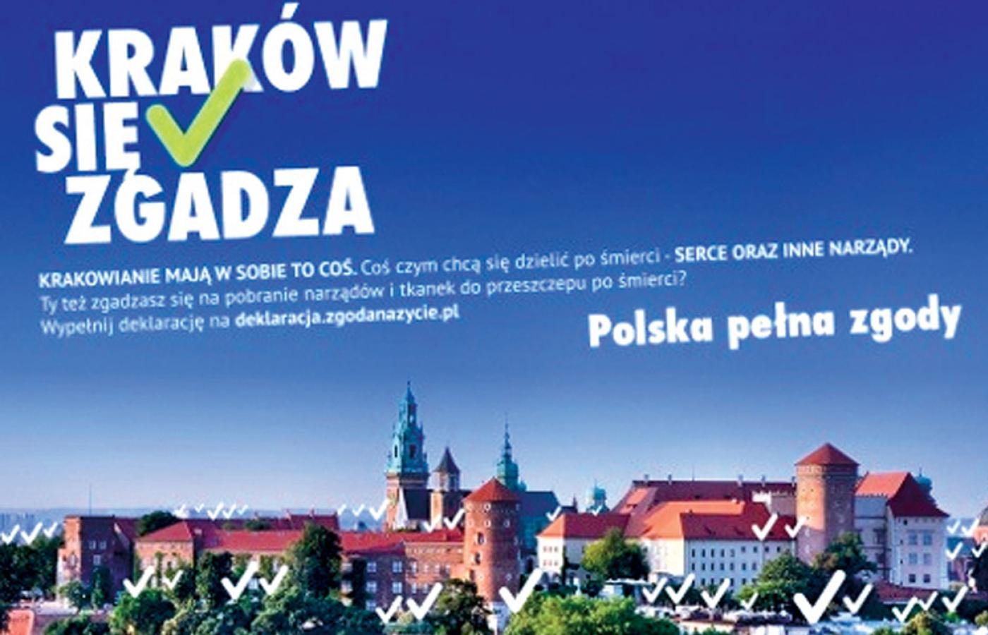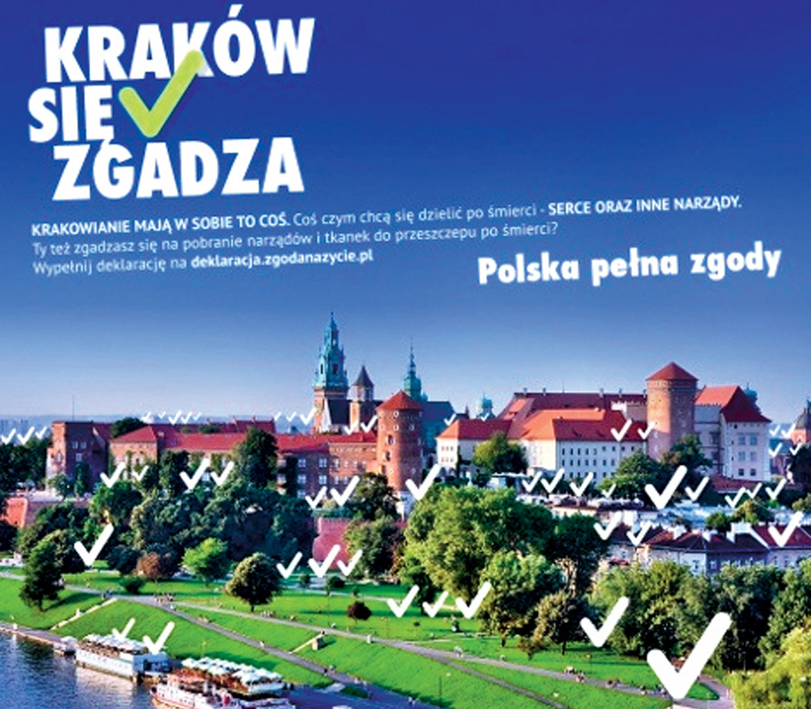„Krakowianie mają w sobie to coś. Coś, czym chcą się podzielić po śmierci”. Hasła tego typu, w których zmieniono tylko nazwy mieszkańców poszczególnych miejscowości, możemy poza Krakowem znaleźć na plakatach w Katowicach, Rzeszowie, Szczecinie, Toruniu, Łodzi i Kielcach. Miasta te zaangażowały się w organizowaną przez Ministerstwo Zdrowia kampanię „Zgoda na życie”, której głównym celem jest zachęcenie Polaków do publicznego wyrażenia zgody na pobranie po śmierci tkanek i narządów do przeszczepu. Akcję wspiera wielu artystów i osoby publiczne, m.in. Krystyna Janda, Piotr Machalica, Sylwia Chutnik czy Jurek Owsiak.