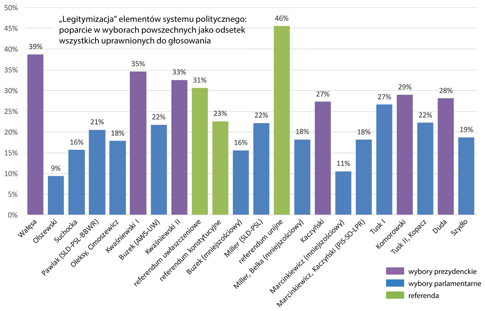 Przeliczyliśmy wyniki wszystkich wyborów od 1990 r., by porównać tak rozumianą „legitymizację” kolejnych rządów (w przypadku koalicji to suma głosów zdobytych przez partie koalicyjne), prezydentów i decyzji podjętych w referendach.