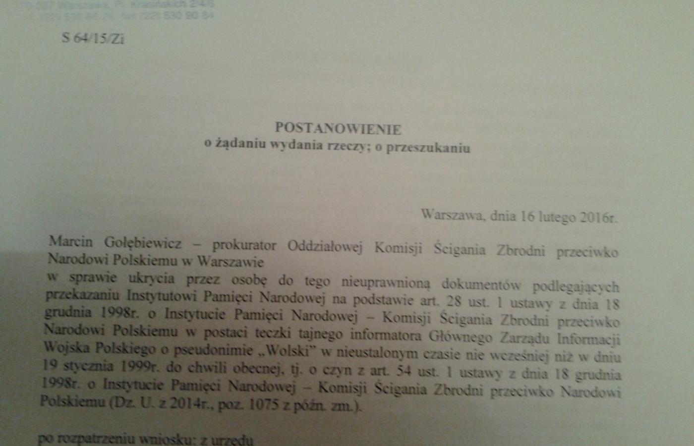 Prokurator Instytutu Pamięci Narodowej szukał materiałów dotyczących tajnego informatora Głównego Zarządu Informacji Wojska Polskiego o pseudonimie Wolski. Tak wynikało z pisemnego postanowienia o przeszukaniu i żądaniu wydania rzeczy.