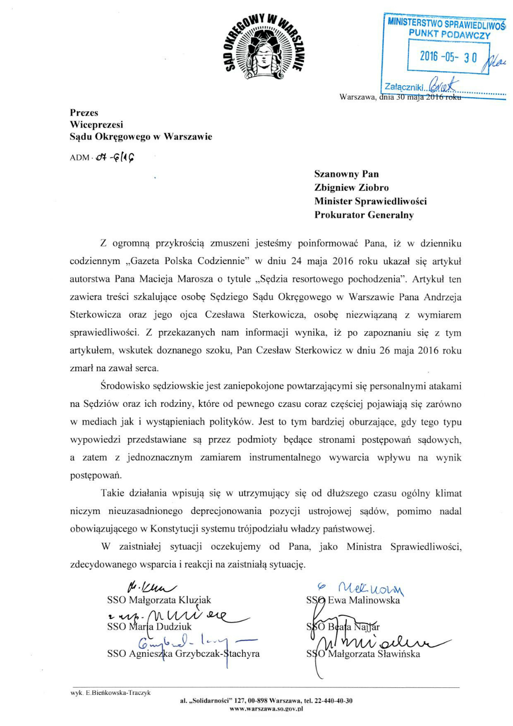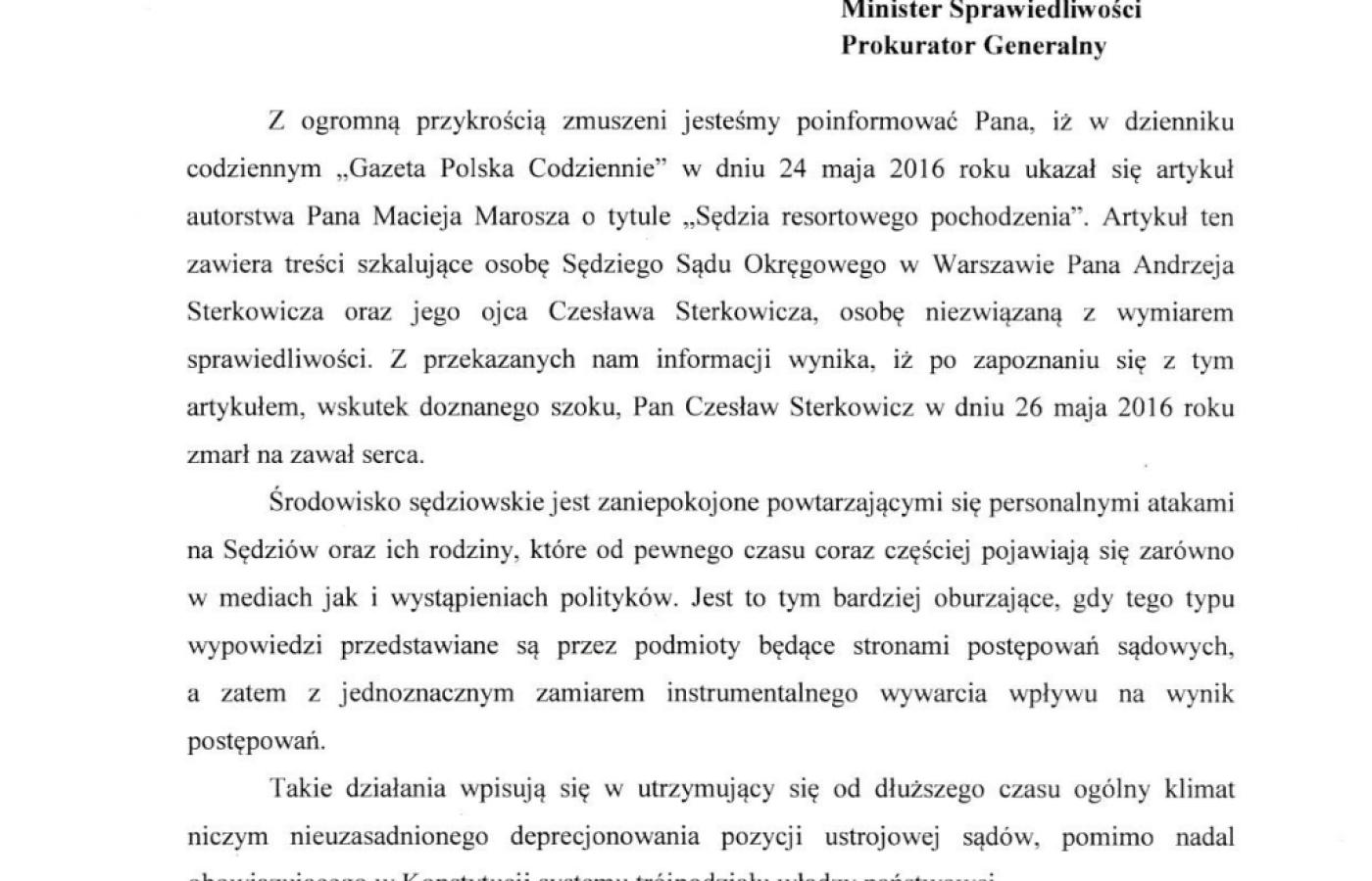 Prezes Sądu Okręgowego w Warszawie Małgorzata Kluziak i pięcioro wiceprezesów w specjalnym liście informują Zbigniewa Ziobrę, że w „Gazecie Polskiej Codziennie” 24 maja ukazał się artykuł szkalujący sędziego Andrzeja Sterkowicza oraz jego ojca.