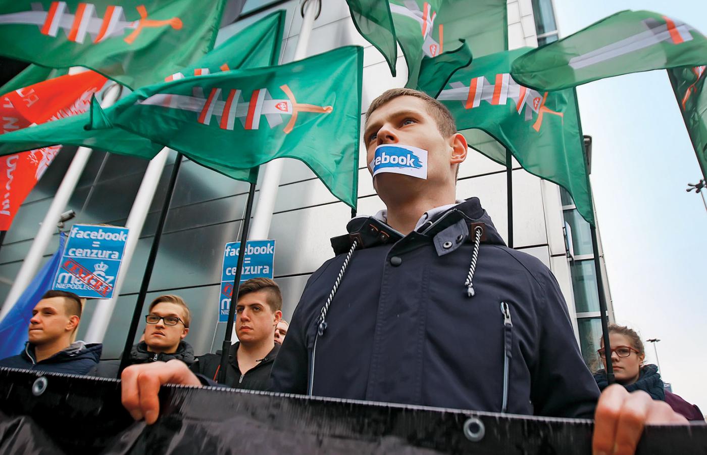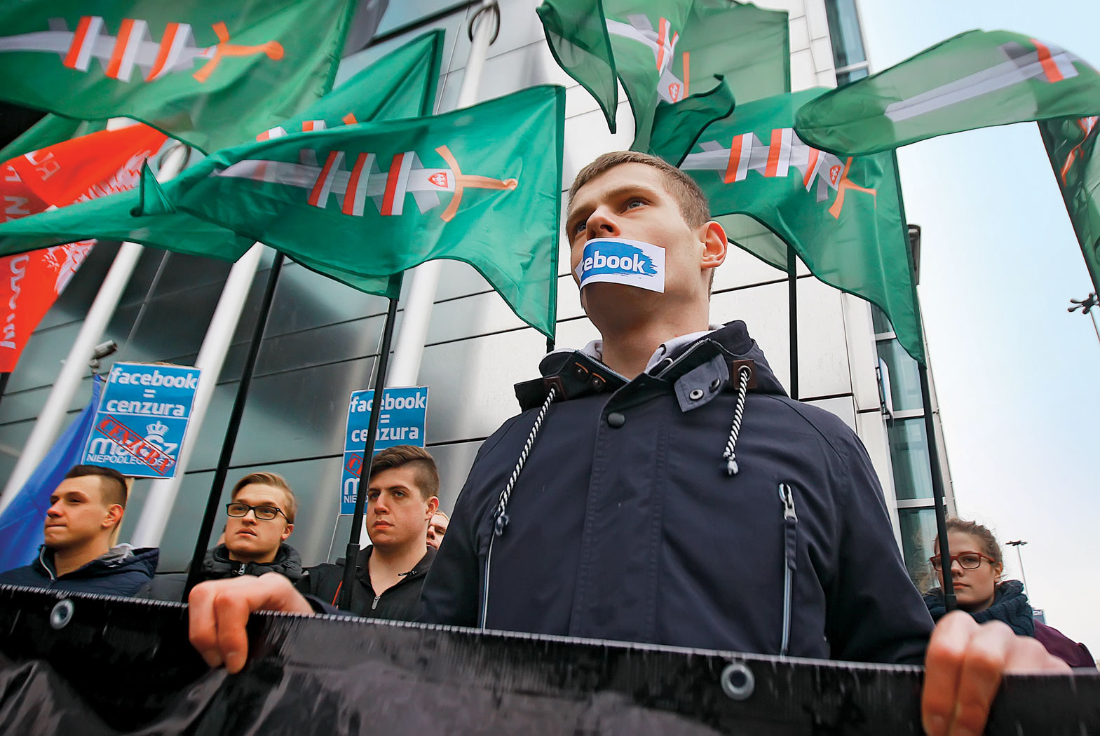 Ugrupowania nacjonalistyczne regularnie umieszczają na Facebooku treści rasistowskie. Nie są one zgodne z polityką działania międzynarodowego serwisu społecznościowego, więc konta tych ugrupowań dość regularnie są blokowane – czasowo lub na stałe. Także w Polsce to nic nowego, pod koniec października usunięte zostały z Facebooka konta m.in. Młodzieży Wszechpolskiej, Ruchu Narodowego, ONR i Marszu Niepodległości. Jednak tym razem blokada – nazywana w internecie „banem” – okazała się wyjątkowo bolesna. Organizatorzy Marszu Niepodległości wciąż bowiem zbierali pieniądze potrzebne na zorganizowanie 11 listopada w Warszawie legalnego i zarejestrowanego wcześniej wydarzenia, gdy na kilka dni zostali usunięci z Facebooka (po raz czwarty w tym roku). Powód? Na plakacie promującym marsz umieścili Falangę, znak wykorzystywany przed wojną przez faszyzujący ONR-Falanga (czytaj s. 57), przejęty w obecnych czasach przez ONR i Narodowe Odrodzenie Polski.